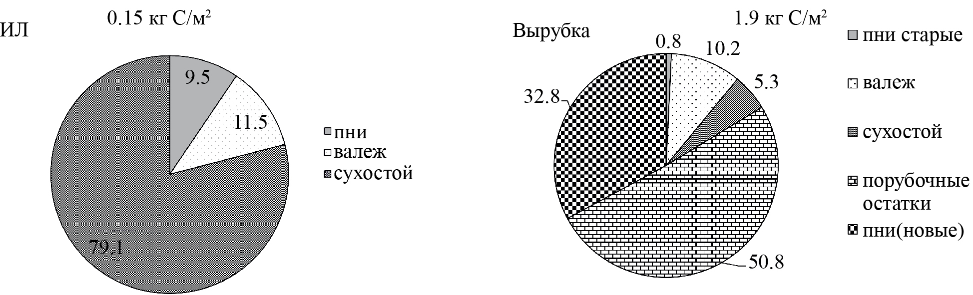 Рубка леса приводит к значительному уменьшению и перераспределению запасов углерода в рассматриваемых компонентах экосистем. Общий запас углерода на вырубке составляет 8.1 кг С/м2. Показано, что в составе стволовой древесины с вырубки выносится 6.6 кг С/м2, что составляет 44.84% от запасов углерода исходной экосистемы или 71.8% от углерода биомассы древостоя. В экосистеме вырубки лишь 7.1% запасов углерода сосредоточено в составе лесной растительности. Запас углерода, сосредоточенного в составе почв, практически не изменяется при рубке. Но при этом вклад запасов углерода почв в общие запасы углерода экосистем возрастает до 66.8%. Поступление порубочных остатков и оставление пней приводит к существенному увеличению доли крупных древесных остатков до 23.4% (1.9 кг С/м2). Более половины запасов КДО представлены порубочными остатками и почти треть (32.8%) вновь образованными пнями. На вырубке несколько увеличивается содержание углерода биомассы растений напочвенного покрова до 0.222 кг С/м2 (или 2.7% от общих запасов углерода экосистемы).