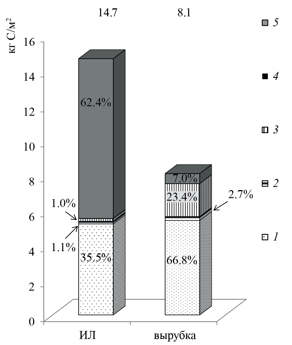 Рис. 4. Вклад углерода отдельных пулов в исходном лесу (ИЛ) и на вырубке: 1 – запасы в почвах; 2 – биомасса растений напочвенного покрова; 3 – крупные древесные остатки (сухостой, валеж, пни; на вырубке добавляются порубочные остатки, в том числе вновь образованные пни); 4 – запасы в подросте; 5 – запасы в древостое.