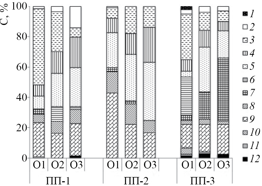 Рис. 1. Доля углерода идентифицированных кислот в составе водорастворимых соединений кислотной природы в подгоризонтах лесных подстилок почв ельника чернично-зеленомошного (ПП-1), лиственно-елового молодняка (ПП-2) и спелого березняка разнотравного (ПП-3): 1 – 3,4-диоксибензойная кислота, 2 – 3-гидроксимасляная кислота, 3 – яблочная кислота, 4 – глицериновая кислота, 5 – 2,3,4-тригидроксибутановая кислота, 6 – галактоновая кислота, 7 – рибоновая кислота, 8 – 2-гидрокисуксусная кислота, 9 – 2-гидроксипропановая кислота, 10 – валерьяновая кислота, 11 – гексадионовая кислота, 12 – бутандионовая кислота.