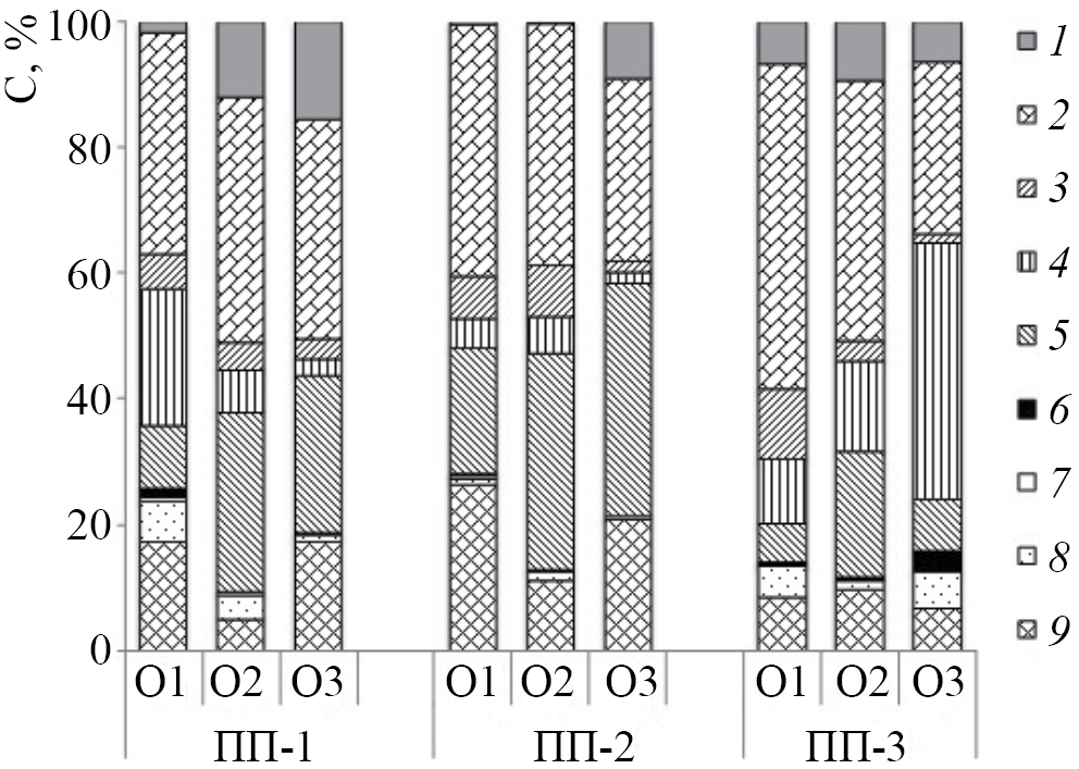 Рис. 2. Доля углерода идентифицированных углеводов в подгоризонтах лесных подстилок почв ельника чернично-зеленомошного (ПП-1), лиственно-елового молодняка (ПП-2) и спелого березняка разнотравного (ПП-3): 1 – сахароза, 2 – глюкоза, 3 – D-монопираноза, 4 – D-фруктоза, 5 – галактопираноза, 6 – D-риботураноза, 7 – D-рибофураноза, 8 – D-рибоза, 9 – арабиноза.