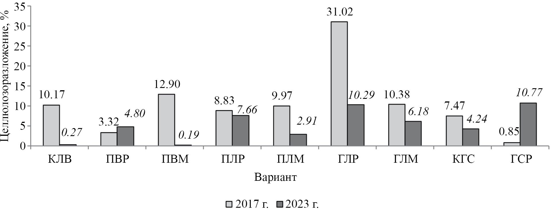 Анализ целлюлозоразлагающей способности почвы (ЦСП) показал, что в 2017 г. данный процесс протекал интенсивнее по сравнению с 2023 г. в среднем в 12.9 раза (рис. 4). При этом максимальное значение приходилось на вариант ГЛР (31%), а минимальное – на ГСР (0.9%). В 2023 г. именно на этих участках отмечалось наиболее активное целлюлозоразложение, показатели которого находились в диапазоне 10.3–10.8%, что обусловлено наличием мертвых корней лиственницы и сосны после пожара (рис. 5). В 2023 г. минимальными значениями ЦСП характеризовался вариант ПВМ (0.19%). Обнаружена слабая положительная корреляция между целлюлозоразлагающей способностью почвы и численностью грибов-целлюлозолитиков (r = 0.4), а также отрицательная – с бактериями (r = –0.4).