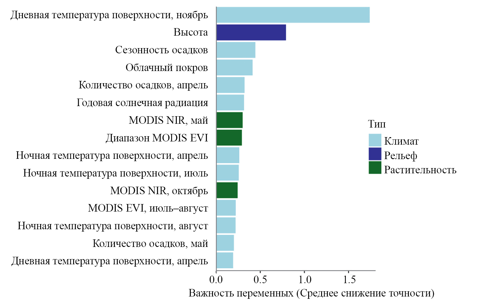 Важность пространственных переменных. На рис. 4 представлен анализ важности ковариат после 100 повторений. Поскольку количество предикторов в модели машинного обучения составило 61, показаны только 15 наиболее важных переменных. Согласно результатам, наиболее важной переменной являлась дневная температура поверхности в ноябре. На втором месте расположилась высота над уровнем моря, далее сезонность осадков и облачность. Также три переменные растительности (MODIS NIR для мая и октября, MODIS EVI для июля–августа) были включены в топ 15 переменных. Таким образом, преимущественно климатические факторы и высота над уровнем моря оказались наиболее влиятельными переменными для пространственного распределения содержания Сорг в горах Южного Урала.