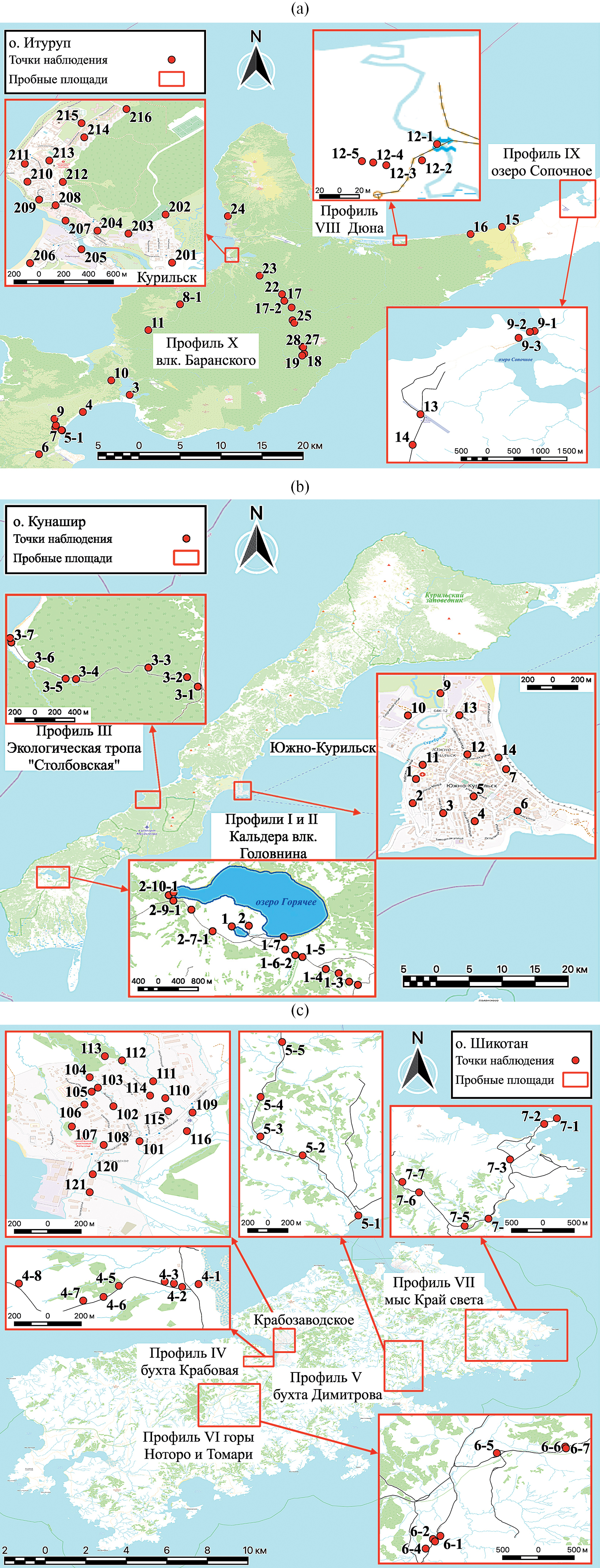 Рис. 1. Карта-схема расположения пробных площадей на Южных Курилах: о. Итуруп (a), о. Кунашир (b), о. Шикотан (c).