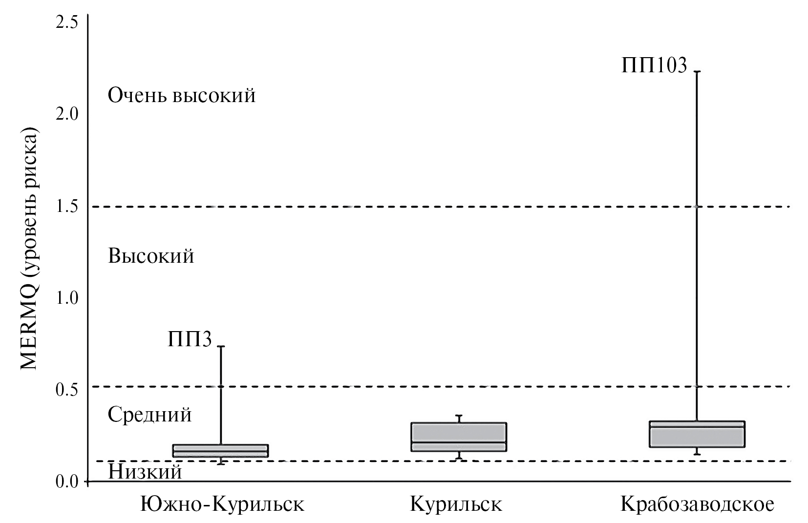 Рис. 2. Индекс вероятности токсичности (уровень риска) почв на урбанизированных территориях южных Курильских островов (прерывистые линии – границы зон, “усы” – указаны минимальные и максимальные значения, в диаграмме размаха горизонтальные линии – значения первый и третий квартили, черная линия внутри – медиана).