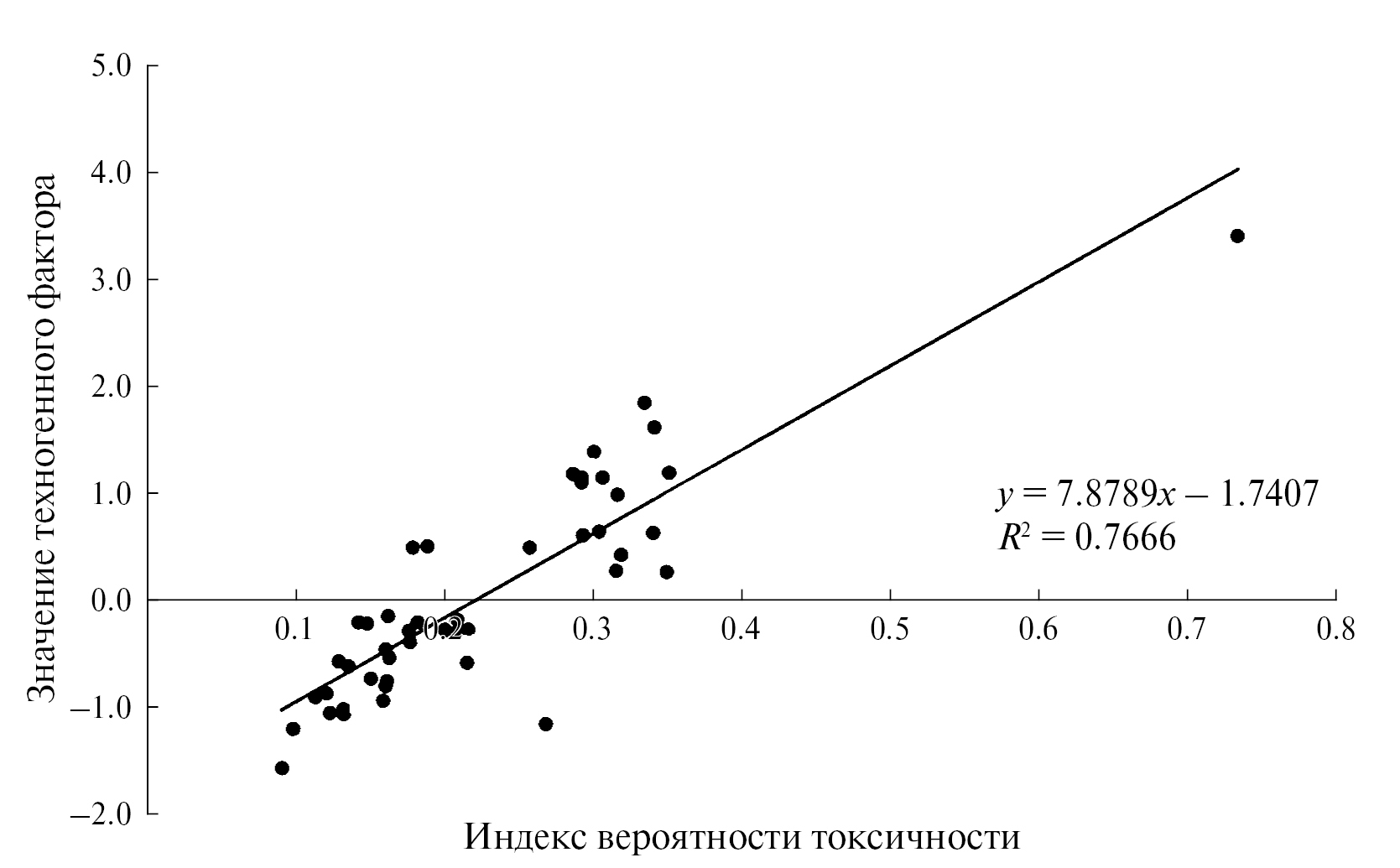Рис. 3. Регрессионная зависимость индекса вероятности токсичности и значений техногенного фактора.