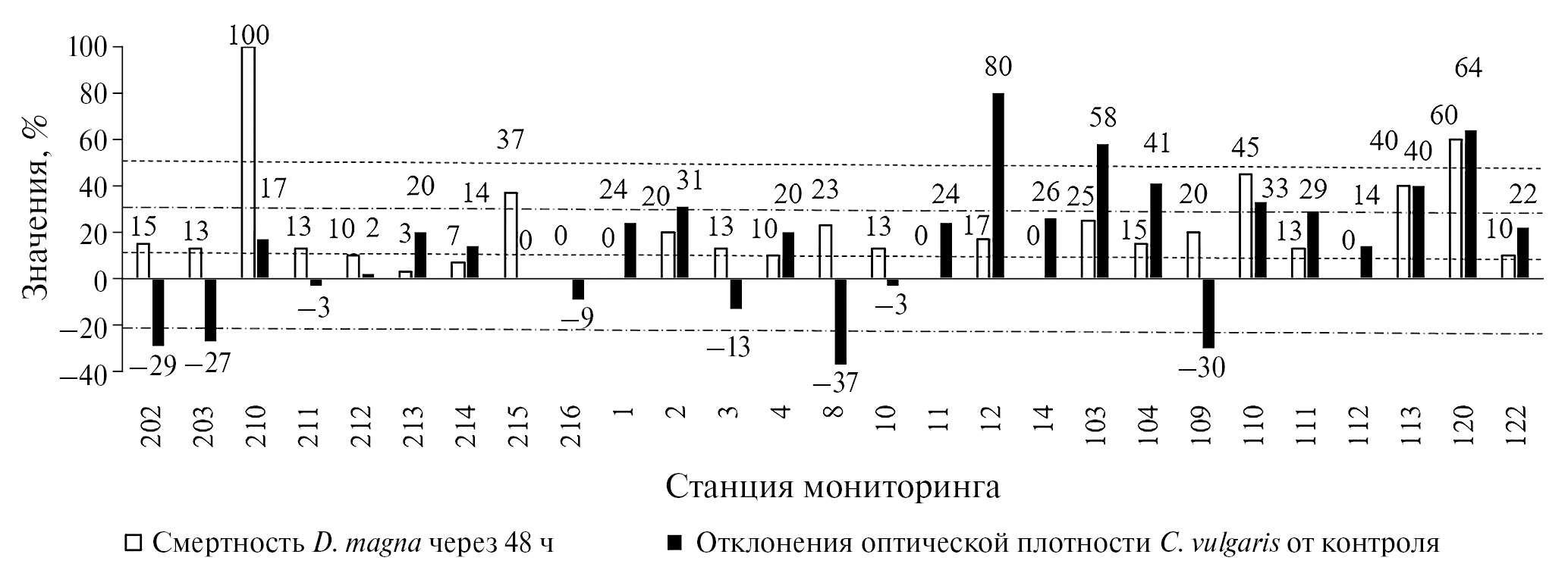 Рис. 4. Результаты биотестирования городских почв: - - - - уровень токсичности по реакции D. magna (смертность более 10% – токсичность; более 50% – острая токсичность); : -·-·-·-· уровень токсичности по реакции C. vulgaris (отклонения оптической плотности менее –20% или более 30% – токсичность).