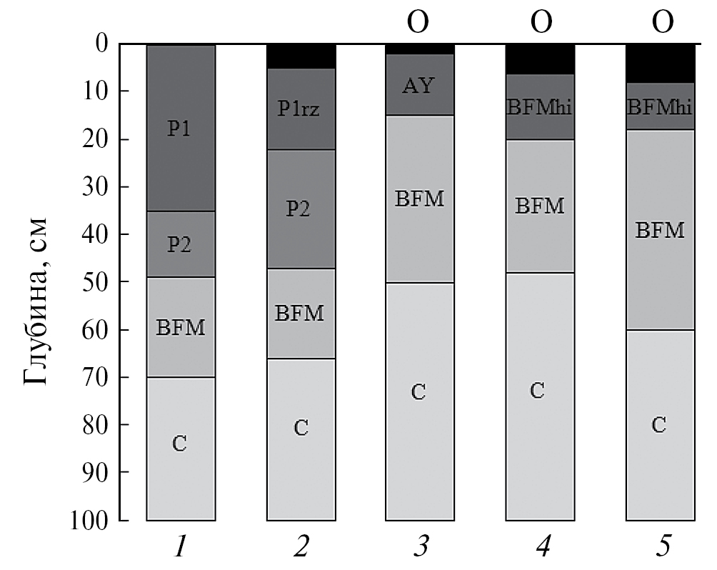 Рис. 1. Схематическое строение почвенных профилей: 1 – пашня; 2 – сенокос; 3 – лес, 15 лет; 4 – лес, 75 лет; 5 – лес, 100 лет.