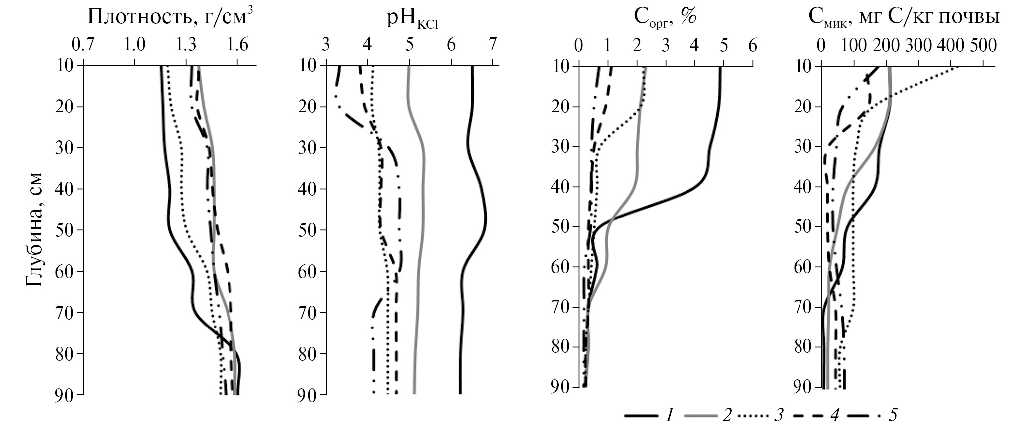 Рис. 2. Изменение почвенных свойств по профилю (среднее, n = 3): 1 – пашня; 2 – сенокос; 3 – лес, 15 лет; 4 – лес, 75 лет; 5 – лес, 100 лет.
