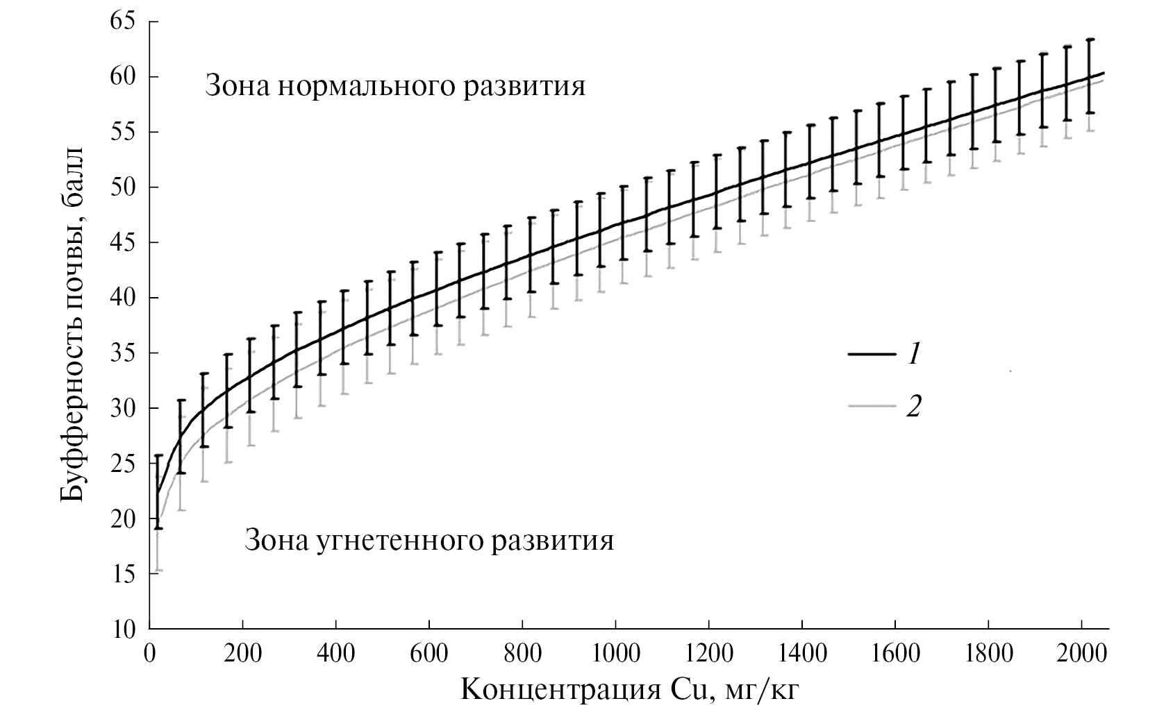 В качестве примера рассчитаем ПДКCu для серой почвы и чернозема обыкновенного при соответствующих им значениях буферности: QBuf = 22.5 и 39.5 балла. Для серой почвы при буферности 22.5 балла величина ПДКCu = 39 ± 11 мг/ кг, а для чернозема при буферности 39.5 балла ПДКCu = 658 ± 219 мг/кг. Рассчитанное значение ПДКCu для серой почвы соответствует величинам ОДКCu для кислых суглинистых и глинистых почв с рНKCl < 5.5. Соответствующая величина ПДКCu, рассчитанная для чернозема, в 5 раз превышает значение ОДК для суглинистых и глинистых почв близких к нейтральным или нейтральным с pHKCl > 5.5 [4]. Таким образом, буферные свойства почв играют исключительно важную роль в определении ПДК.
