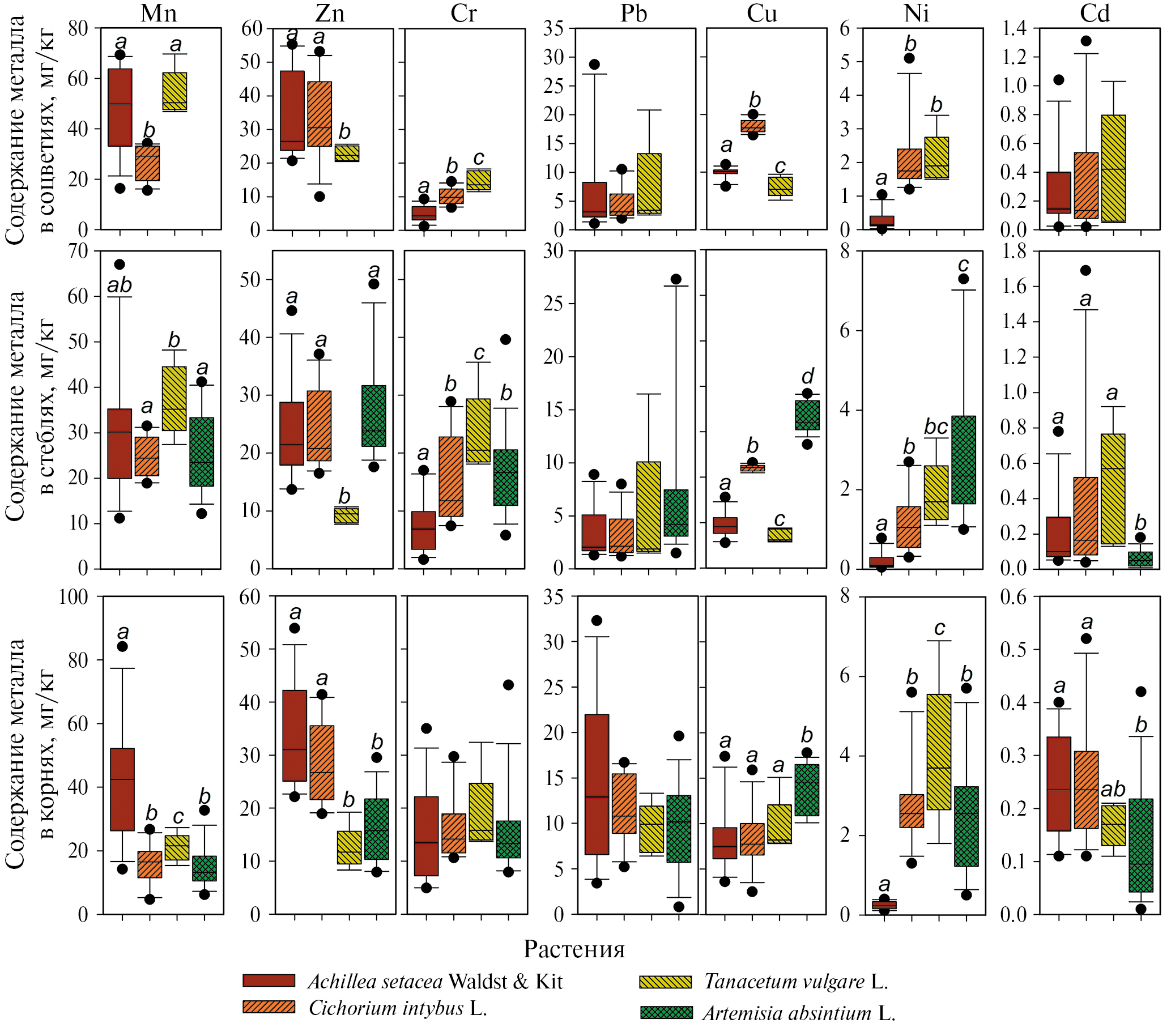 Рис. 3. Содержание тяжелых металлов в корнях, стеблях и соцветиях 4 видов растений импактной зоны электростанции. Буквы указывают на значимые различия, полученные при помощи Tukey honest significant difference for unequal N при р < 0.05.