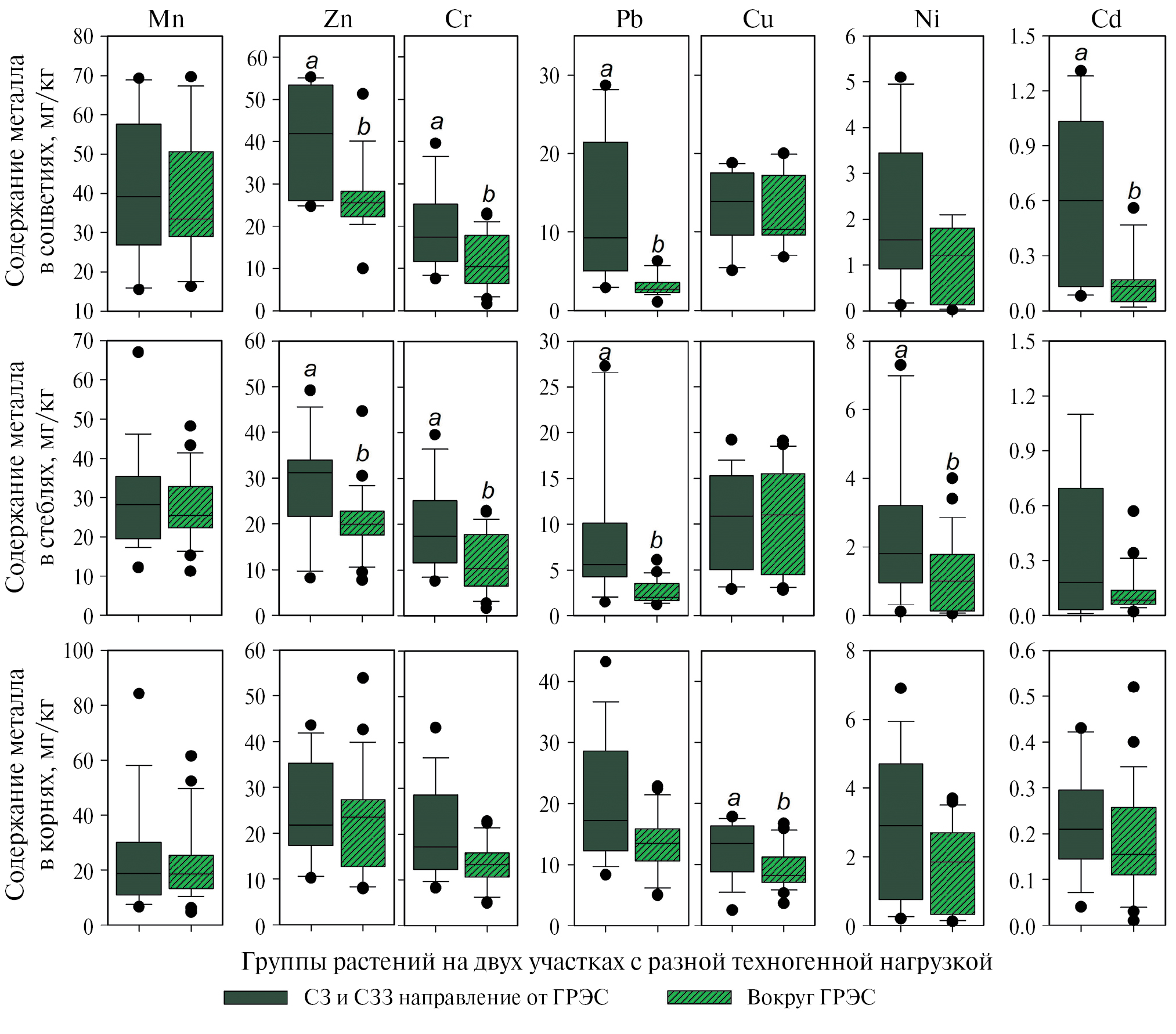 Рис. 4. Содержание тяжелых металлов в корнях, стеблях и соцветиях растений, сгруппированных по произрастанию на двух участках с разной техногенной нагрузкой: возле электростанции, в направлении СЗ и СЗЗ от ГРЭС. Буквы указывают на значимые различия, полученные при помощи Tukey honest significant difference for unequal N при р < 0.05.