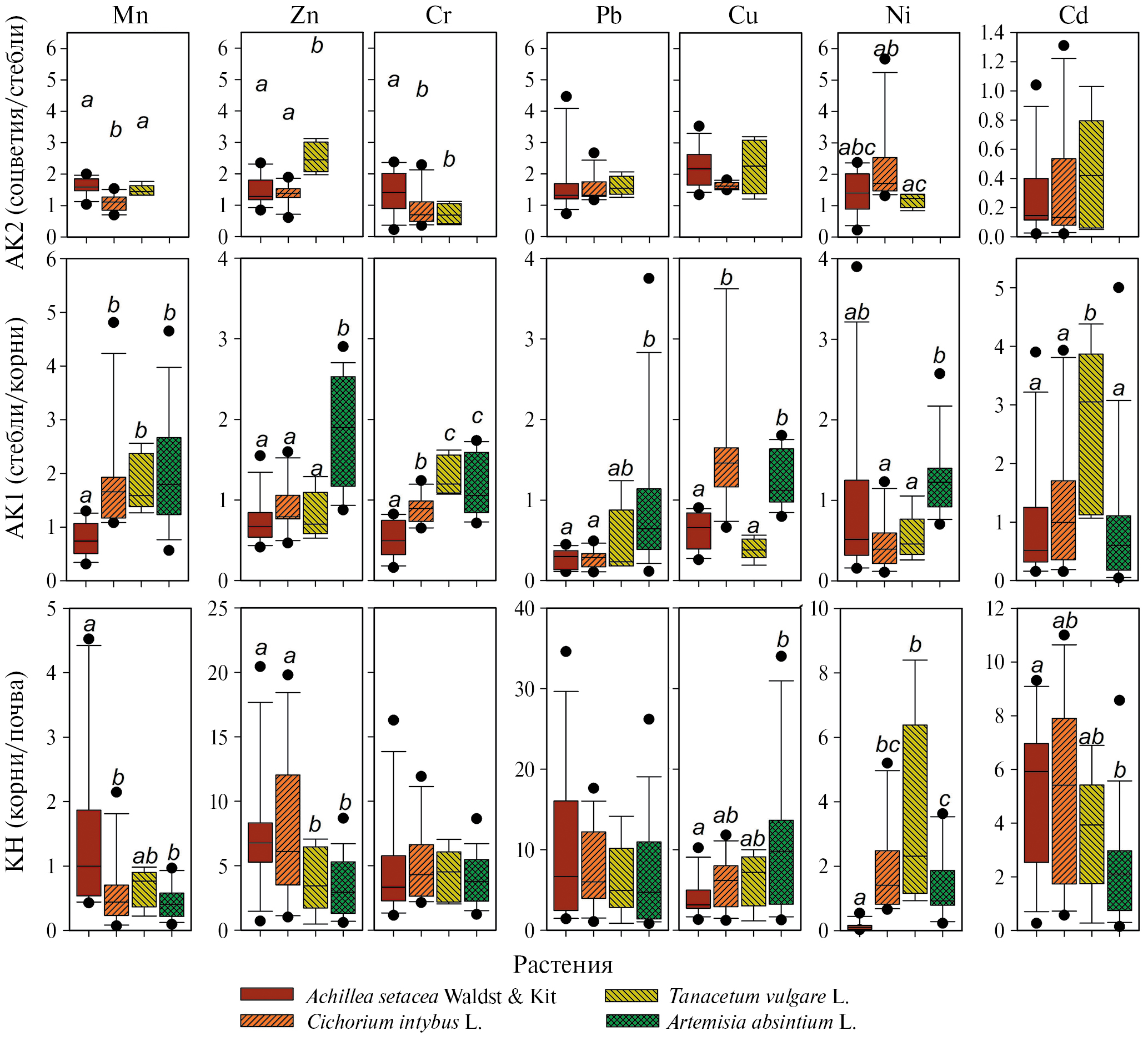 Рис. 5. Коэффициенты перераспределения тяжелых металлов в системе почва–корень (КН), корень–стебель (АК1) и стебель–соцветие (АК2). Буквы указывают на значимые различия, полученные при помощи Tukey honest significant difference for unequal N при р < 0.05.