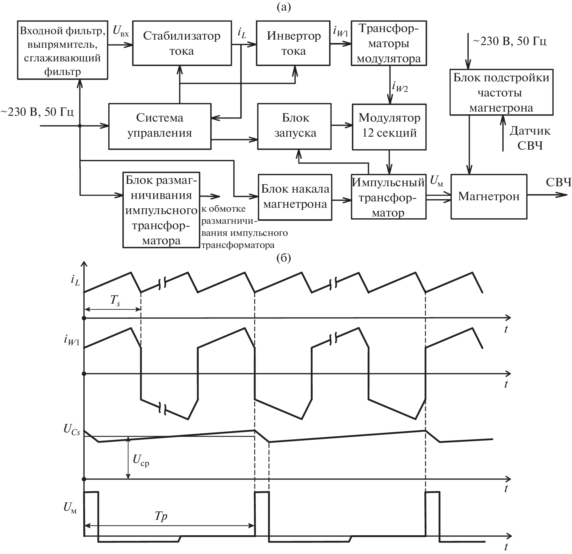 A pulsed magnetron system generating high-energy microwave pulses with a frequency of 400 Hz and an average power of 0.5 kW is described. To generate a magnetron current pulse, a circuit with 12 identical transistor modules with an operating voltage of 800 V, which are connected in series to the primary winding of a high-voltage pulse transformer with a transformation ratio of 3.5, is used. Thus, a voltage pulse with an amplitude of up to 26 kV and a 25-A current with an adjustable duration of 100–500 ns is formed. Experimental data of the system operation into the pulsed microwave magnetron and an equivalent load are presented