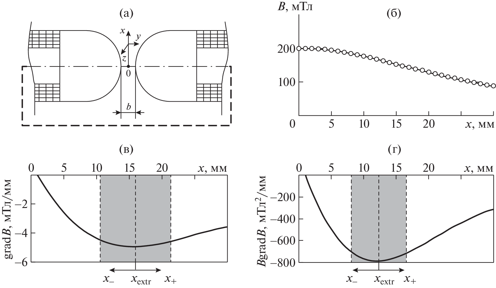 The work describes an updated magnetometer based on the ponderomotive principle in which specially used hemispherical pole pieces create an inhomogeneous magnetic field with zones of virtually constant values of the magnetic gradient (MG) and/or the magnetic force factor (MFF) in the vicinities of the extrema of the coordinate dependences of the MG and MFF. These zones (MGconst and MFFconst) are fixed in the magnetometer by limiters in the form of controllable (laser) markers and have individual values of the coordinates of their conditional centers xextr and lengths ∆x with a permissible error of changes in the MG and MFF data within such zones. It is shown that, at various mutual distances between the hemispherical pole pieces with the diameter D, the MFFconst zone is located almost a third closer to the center-to-center line of the hemispheres (according to xextr/D) in comparison with the MGconst zone and is less extended (according to Δx/D) to the same extent.
