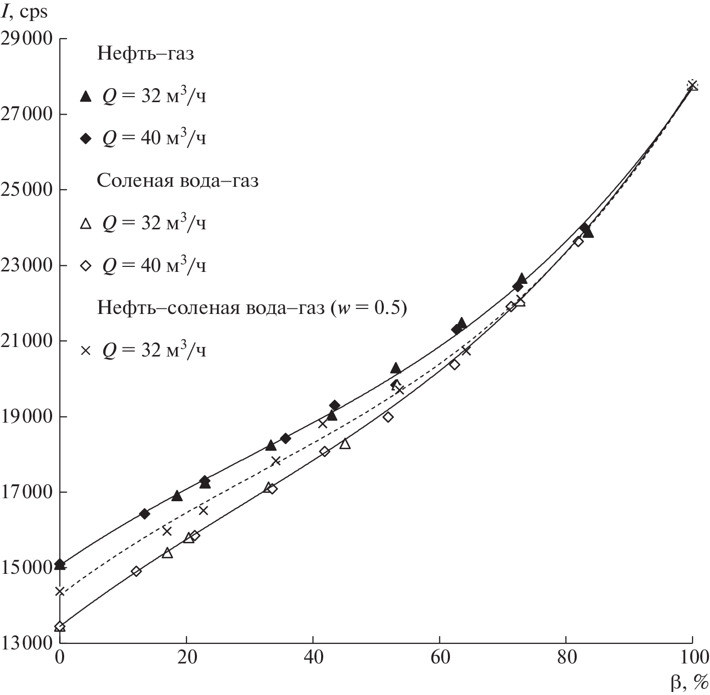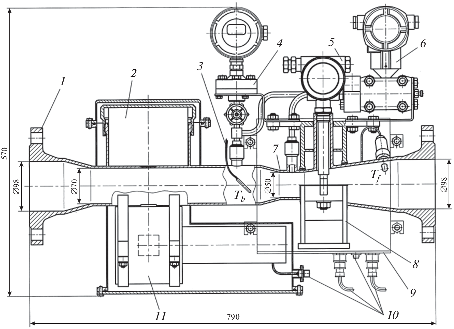 Information on the characteristics of separationless three-phase oil–water–gas flowmeters of horizontal orientation is presented, probably, for the first time; it is related to the optimization of their design based on experimental studies of single-isotope and dual-isotope gamma densitometers (GD) and a combined conical narrowing device (ND), which consists of two sequentially installed cones of various dimensions. The experiments were carried out on both real oil–gas–salt water mixtures at a TUV SUD NEL test bench (Glasgow) and with model exxsol–gas–fresh water flows at the GET195-2011 standard of multiphase flows at the All-Russia Research Institute for Flow Metering (Kazan) using typical flowmeters with a nominal diameter of DN 100. It is shown that it is advisable to install a γ-densitometer in a cross section with an intermediate diameter of D = 70 mm, use a cone of 70/50 mm as the measuring ND, and use a cone of 100/70 mm to preaccelerate the flow in order to reduce the variety of flow regimes of two-phase and three-phase flows in the measuring ND and in the flow part of the γ-densitometer. This significantly improves the characteristics of the prototype flowmeter. Some of the obtained characteristics are compared with those of the well-known Vx Schlumberger vertical analogue, and designs of variants of an advanced horizontal three-phase flowmeter are presented, which also make it possible to increase its service life and raise the operating pressure.