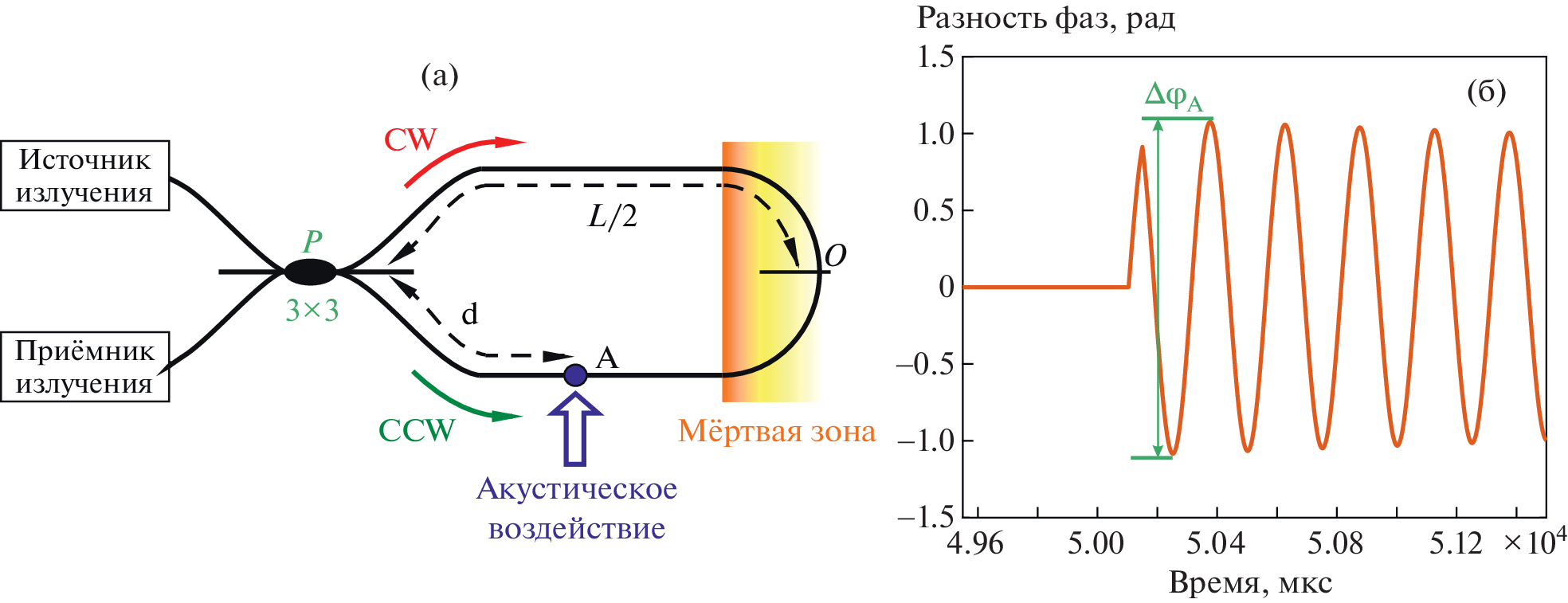 The sensitivity of the Sagnac interferometer for various acoustic influence coordinates was studied. The principles of the formation of a dead zone in an acoustic distributed fiber-optic sensor based on the Sagnac interferometer have been obtained and experimentally confirmed. The response of the interferometer was studied for different types of acoustic impact on the circuit: in the form of a rectangular pulse, sinusoidal, and in the form of a periodic triangular function. The nature of the change in the phase difference at the output of the Sagnac interferometer for each of them was studied. With the found value of the typical frequency ft,hit=10.8 kHz and a loop length of 20 km, numerical simulation and experimental study of the amplitude of the phase difference under acoustic impact through each 1 km of the loop in the range from 0 to 10 km were carried out. A dead zone elimination method is proposed for integrating the Sagnac interferometer into a complex monitoring system using a phase-sensitive optical time domain reflectometer.