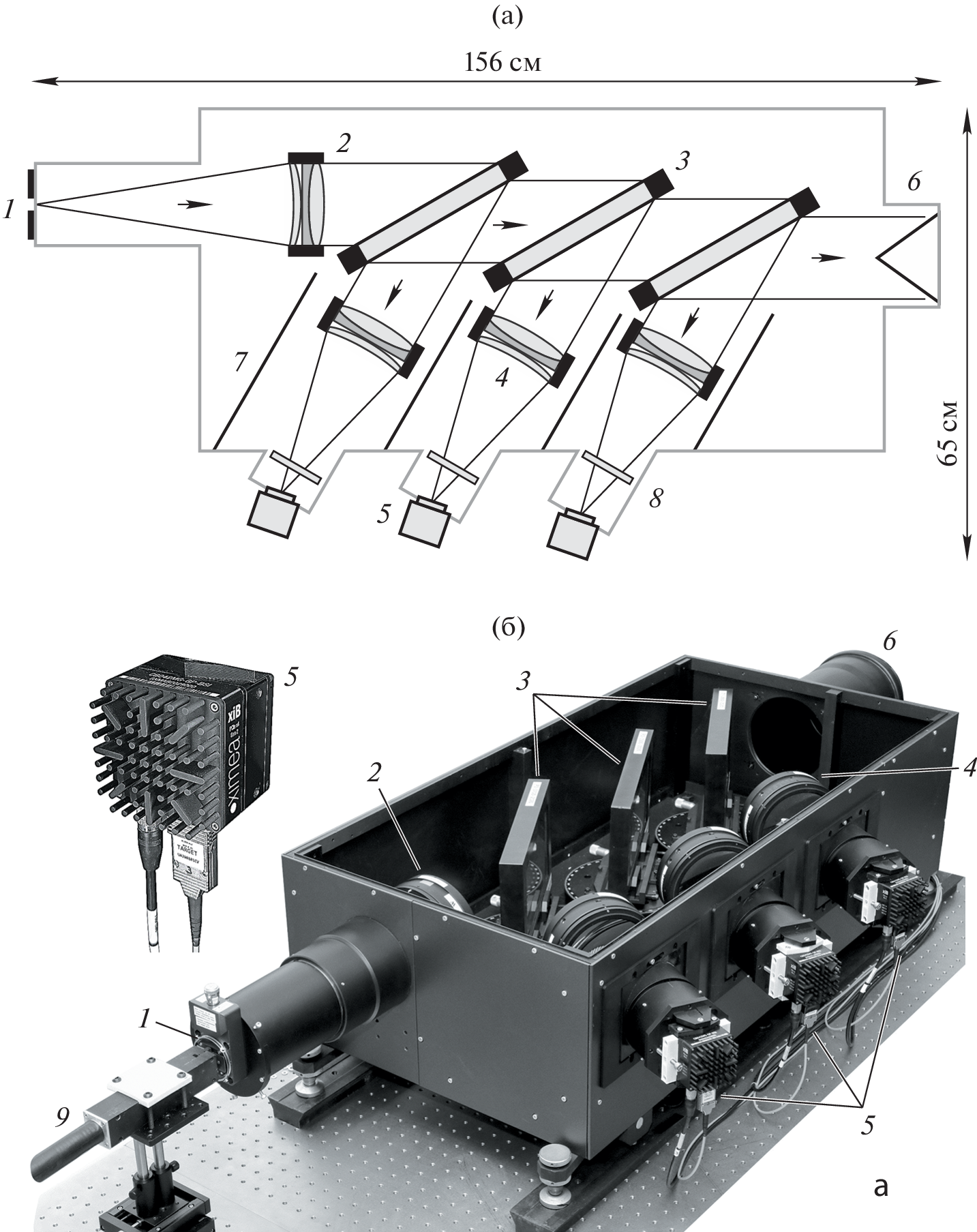 An improved prototype of the large-aperture, high-resolution spectrometer−polychromator (the so-called high-etendue spectrometer, HES) has been designed for spectroscopy diagnostics of plasma, in particular, for the Charge-eXchange Recombination Spectroscopy (CXRS) diagnostics at the ITER facility. Ion temperature profiles, poloidal and toroidal plasma rotation velocities, and low-Z impurity densities can be measured using the CXRS technique. The HES is equipped with novel, high-efficiency compact sCMOS cameras with low noise level, wide dynamic range, high quantum efficiency, and almost 100% working cycle. The HES is based on three transmission holographic gratings, which allow its simultaneous operation in three spectral bands: 468 ± 5, 529 ± 5, and 656 ± 6 nm. The main performance characteristics of the cameras, transmission gratings, and the spectrometer as a unit have been measured. It has been established that the characteristics of the developed HES satisfy the requirements for the spectroscopic equipment intended for measurements of the ITER CXRS diagnostic system.