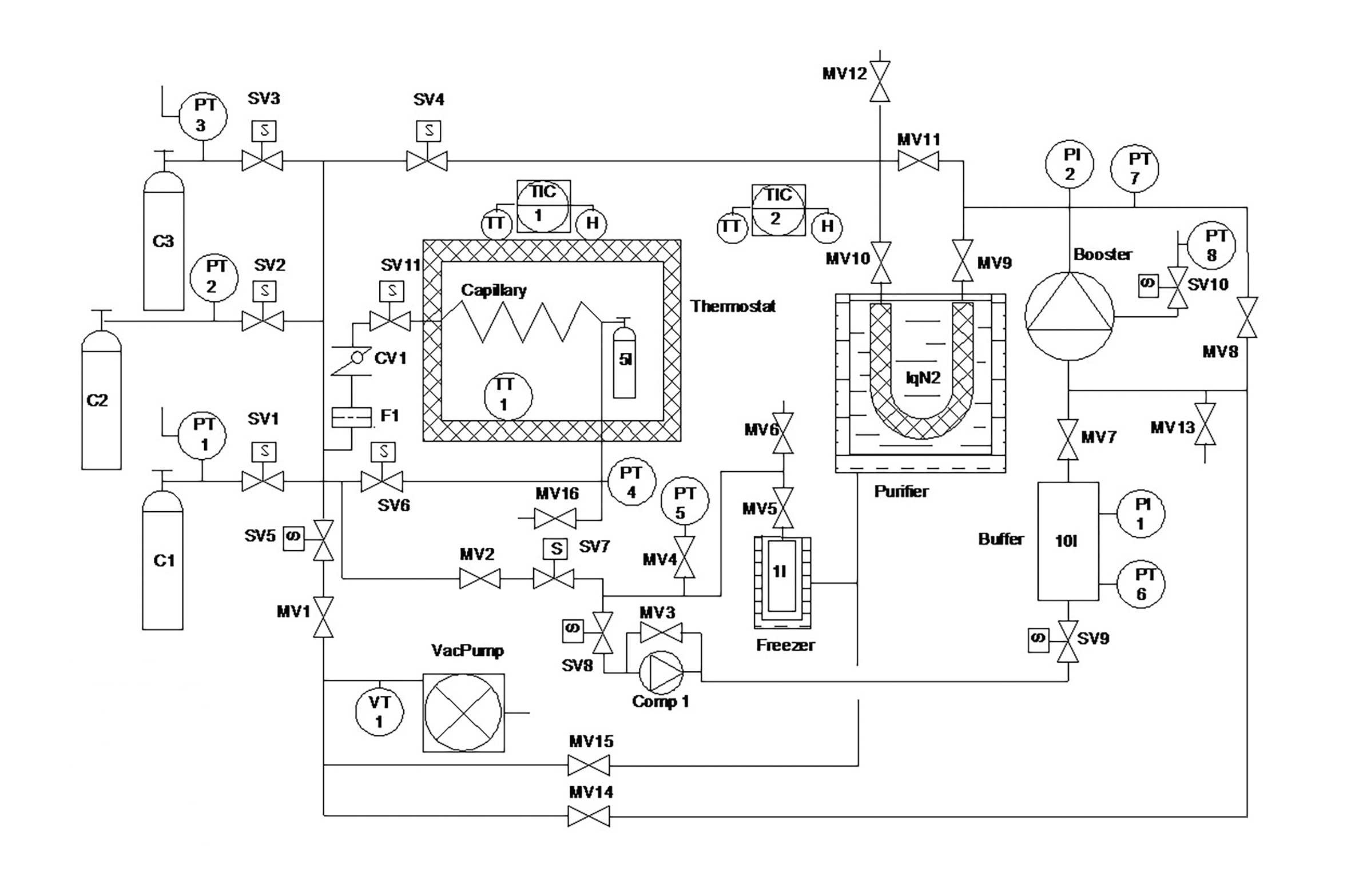 Рис. 1. Принципиальная схема универсальной газовой установки: SV (solenoid valve) – соленоидный клапан, MV (manual valve) – ручной клапан, TT (temperature transmitter) – преобразователь температуры, F (filter) – фильтр, PT (pressure transmitter) – преобразователь давления, PI (pressure indicator) – индикатор давления, Comp (compressor) – компрессор, H (heater) – нагреватель, VT (vacuum transmitter) – вакуумный преобразователь, Capillary – капилляр, Thermostat – термостат, Booster – бустер, Purifier – очиститель, Freezer – вымораживатель, VacPump – вакуумный насос, Buffer – буфер, LqN2 (liquid Nitrogen) – жидкий азот, TIC (temperature indicating controller) – контроллер температуры, CV (check valve) – обратный клапан, C (cylinder) – баллон.