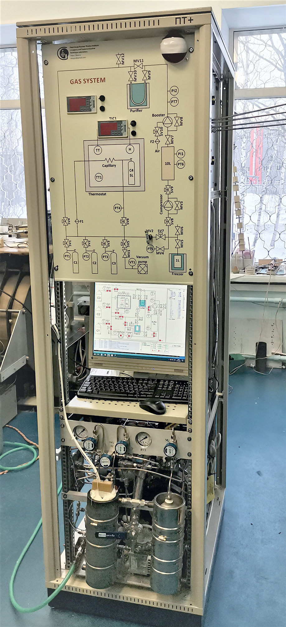 Универсальная газовая установка предназначена для получения трехкомпонентных газовых смесей с использованием статического смешения, выделения и очистки дорогостоящего 3He из смеси СF4 + 3He, а также компримирования последнего при высоком давлении. Принципиальная схема газовой установки представлена на рис. 1. Внешний вид установки представлен на рис. 2.
