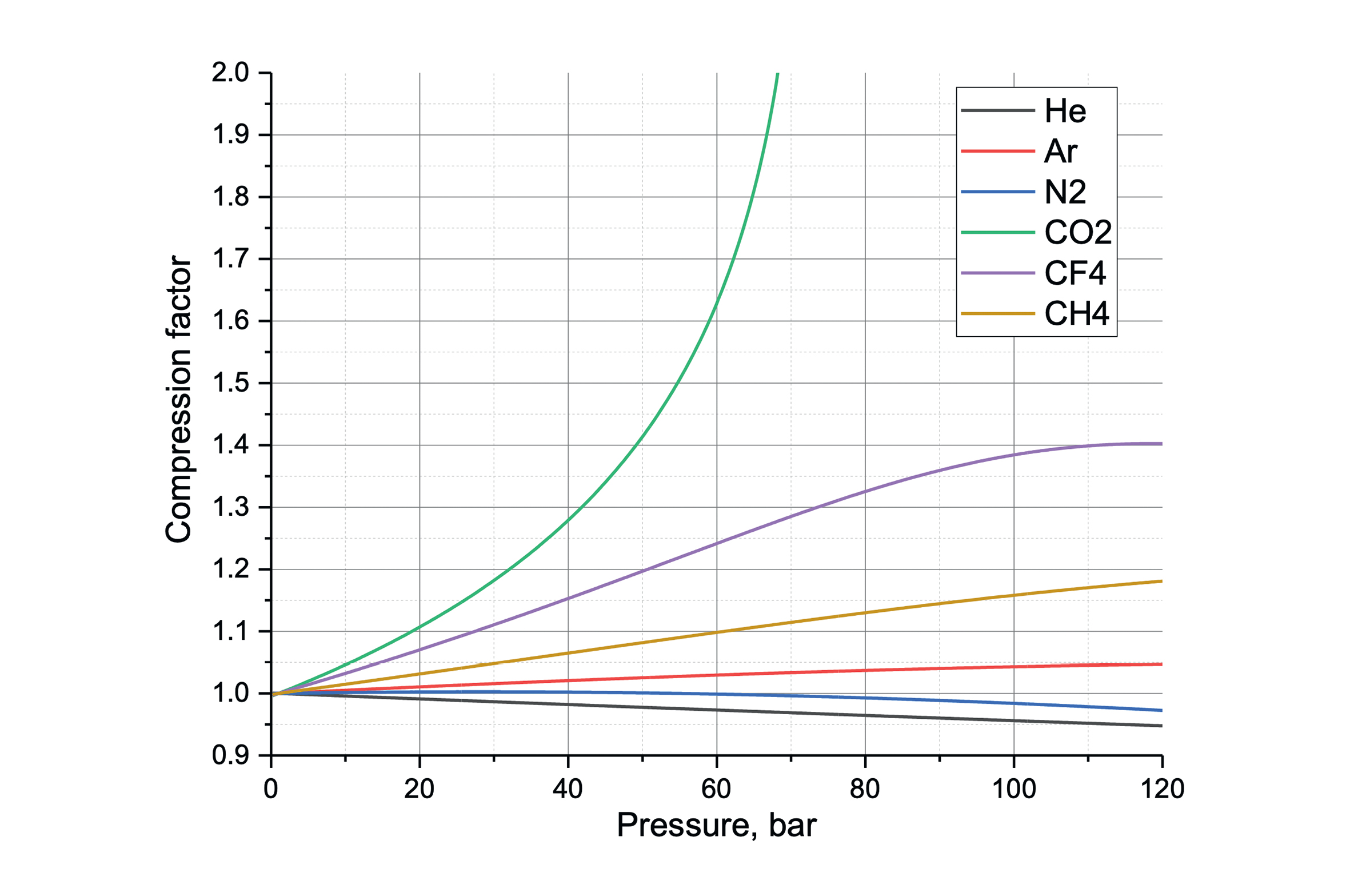 Рис. 3. Коэффициент сжимаемости для разных газов (на основе данных работы [2]).