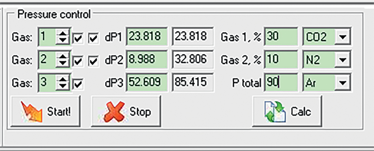 Далее для каждого компонента смеси указывается парциальное давление (dP1, dP2, dP3). Правее указано общее давление смеси, включающей данный компонент. В правой части окна настроек сделан блок расчета парциальных давлений. В нем можно вводить общее давление смеси и процентное содержание первых двух компонентов (P total; Gas 1, %; Gas 2, %) и пересчитывать парциальные давления с помощью кнопки Calc. Расчет ведется с использованием справочных данных о плотности используемых газов [2]. Кнопки Start и Stop запускают и останавливают автоматическую процедуру смешения газов.