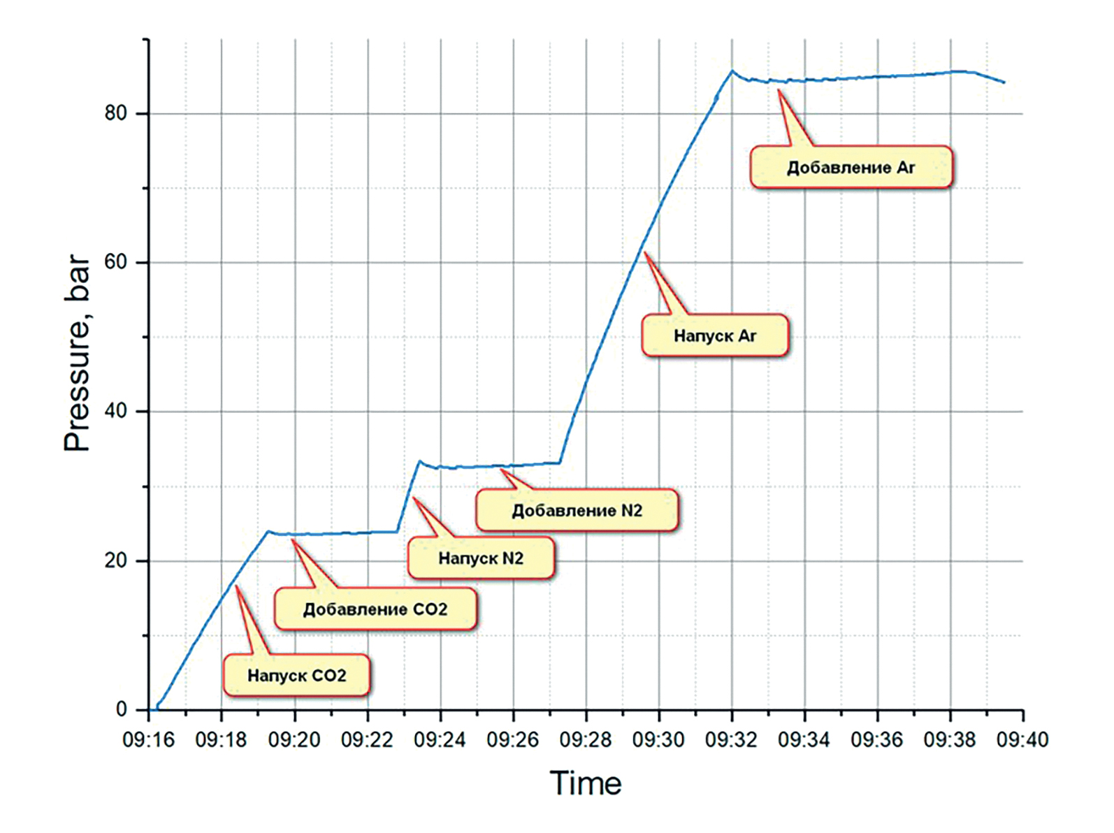 Результат работы программы по автоматическому смешению показан на рис. 6. Проводилось поэтапное смешение трехкомпонентной смеси (30% CO2 + 10% N2 + 60% Ar) по параметрам давления, указанным на рис. 5. После напуска в баллон каждого вида газа программа добавляла газ согласно автоматическому алгоритму с вычислением длительности импульса (рис. 7).