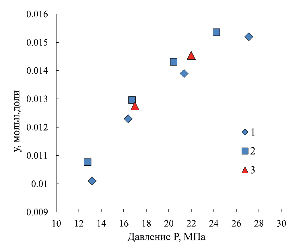Рис. 5. Растворимость дифенила в сверхкритическом диоксиде углерода при T = 328.15 К: 1 – работа [8], 2 – работа [9], 3 – результаты данной работы.