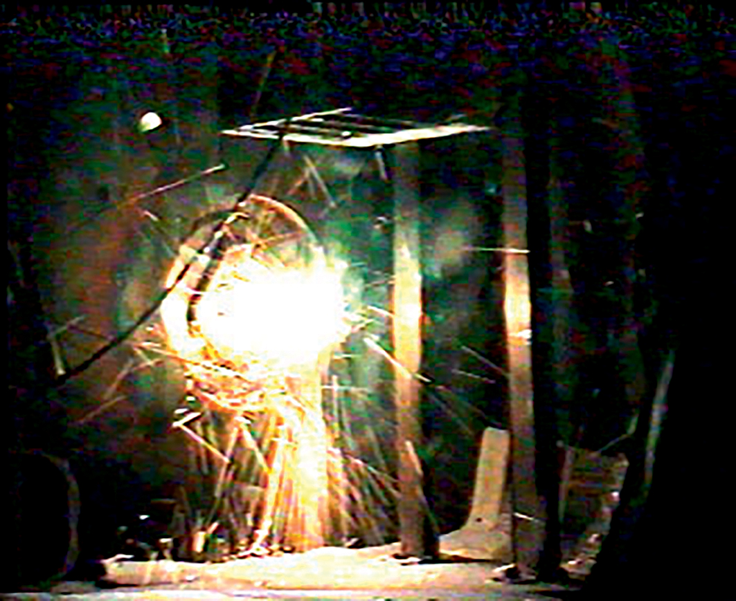 Электростатическая зарядка объектов, находящихся в ЭПП (например, макроскопических мишеней, частиц аэрозоля) или контактирующих с ней (например, стенок контейнера), существенным образом влияет на формирование плазменного объема и протекающие в нем физические процессы. Наиболее просто можно продемонстрировать электростатические эффекты, наблюдая за разлетом частиц облака аэрозоля, в которое инжектируется электронный пучок (рис. 5). В этом эксперименте частицы порошка сыплются сверху сквозь облако ЭПП из вибрирующего сита [1]. За время пребывания в плазме эти частицы успевают накопить заряд (как правило – отрицательный), достаточный для возникновения сильного кулоновского взаимодействия между ними [3]. Интенсивность разлета зависит от давления плазмообразующего газа: по мере повышения Pm интенсивность разлета снижается. При достаточно высоких давлениях (в диапазоне Pm = 1−3 Торр в зависимости от состава плазмообразующего газа) разлет прекращается совсем.