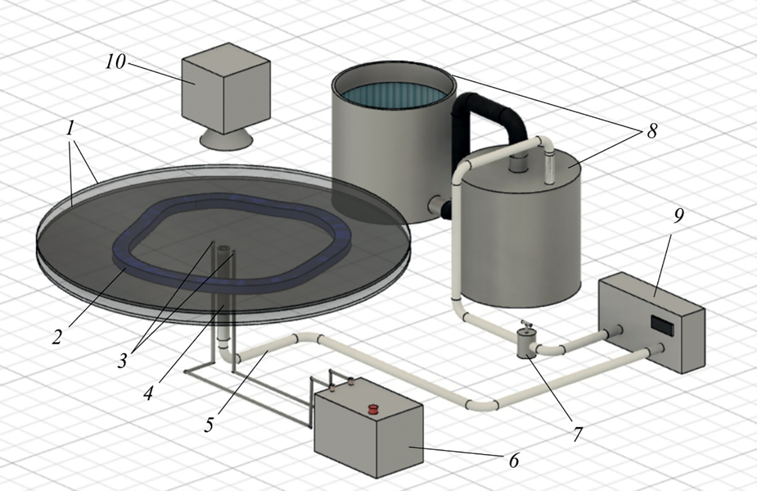 Рис. 1. Схема экспериментальной установки: 1 – прозрачные диски, 2 – фронт пламени, 3 – искровые электроды, 4 – входное сопло с пламегасителем, 5 – газовый шланг подачи смеси, 6 – искровой разрядник, 7 – вентиль, 8 – газометр вытеснения, 9 – расходомер газа, 10 – высокоскоростная фотокамера.
