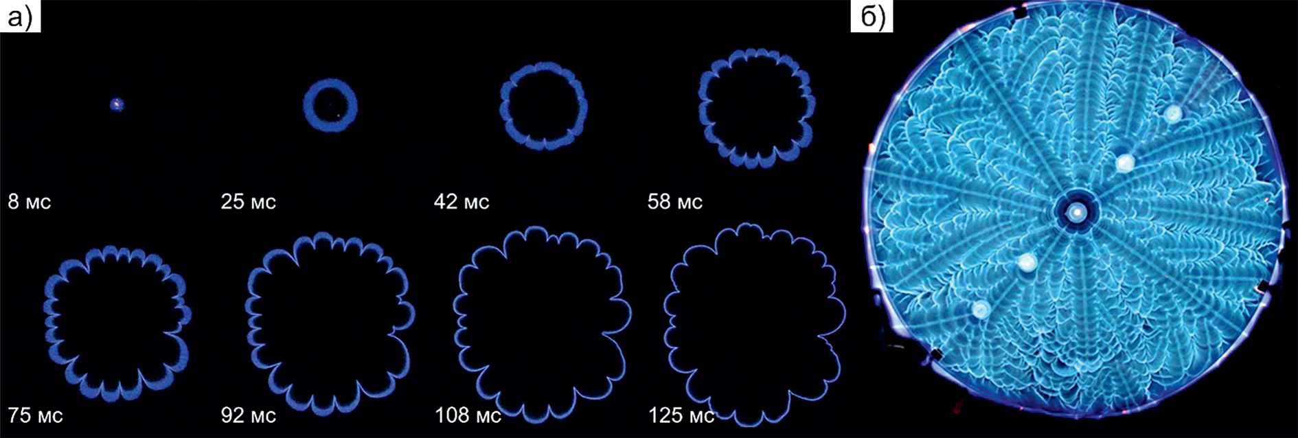 На рис. 2а приведена серия мгновенных снимков фронта пламени в последовательные моменты времени, на рис. 2б − фронт пламени, снятый при длительной экспозиции. Кроме качественного описания формы фронта пламени и характера его движения, используемая техника позволяет зафиксировать промежутки времени между снимками и тем самым определить координаты фронта в различные моменты времени, его мгновенную и среднюю скорости перемещения, число возмущений (ячеек и складок) на его поверхности, их длину и амплитуду. В экспериментах зафиксировано, что при центральном воспламенении смеси фронт пламени сохраняет свою относительную симметрию. Мгновенные снимки, подтверждающие это, приведены на рис. 2а.