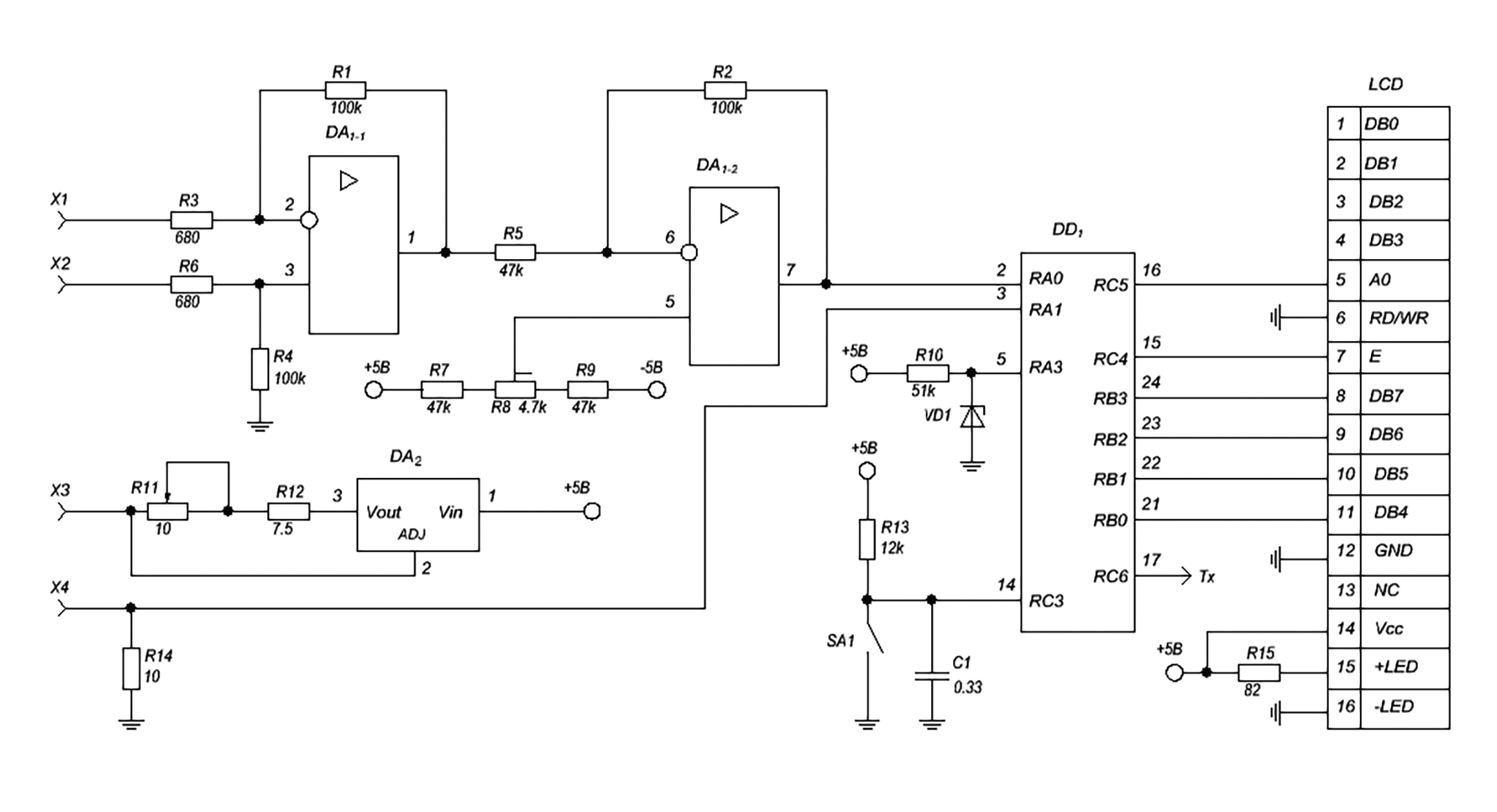 Конструкция индикатора представлена на рис. 1. Аналоговая часть состоит из усилителя напряжения термопары (контакты X1, Х2) на сдвоенном операционном усилителе DA1 с коэффициентом усиления 200 и стабилизатора тока нагревателя в диапазоне 90-150 мА (контакты X3, Х4) на микросхеме DA2. Напряжение питания усилителя DA1 равняется ±5 В.
