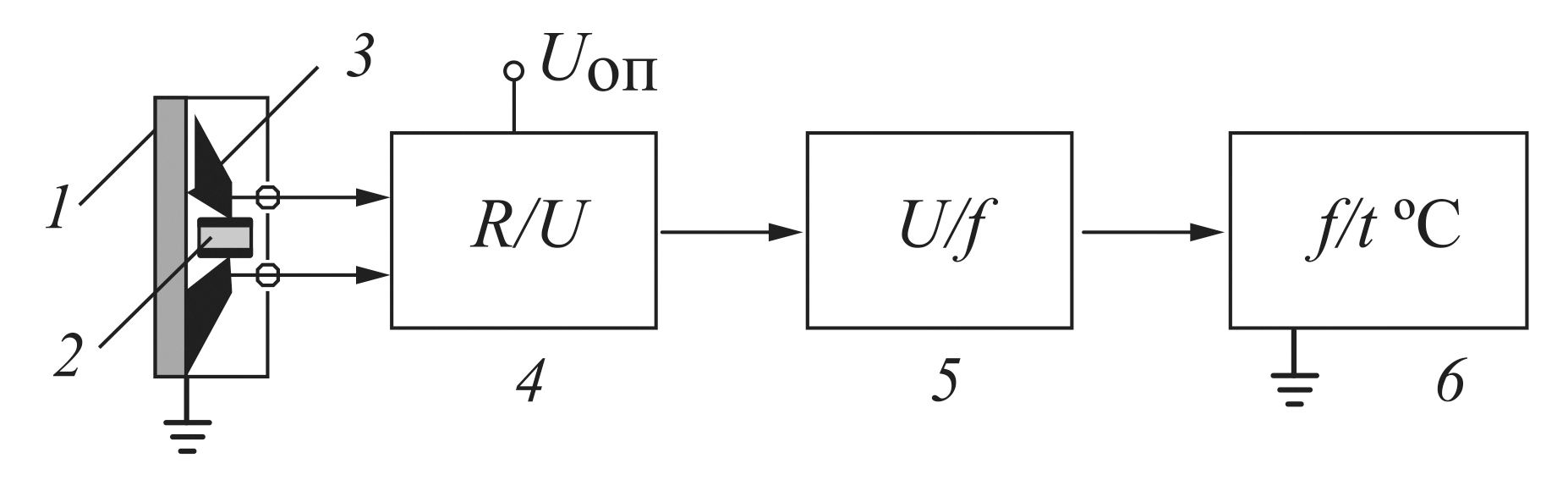 Измерительная часть состоит из блока формирования напряжения 6, преобразователя напряжение–частота 7 и цифрового индикатора температуры 8. В эксплуатационном варианте представляется полезным дополнить схему микропроцессором для передачи данных по USB-шине в персональный компьютер.