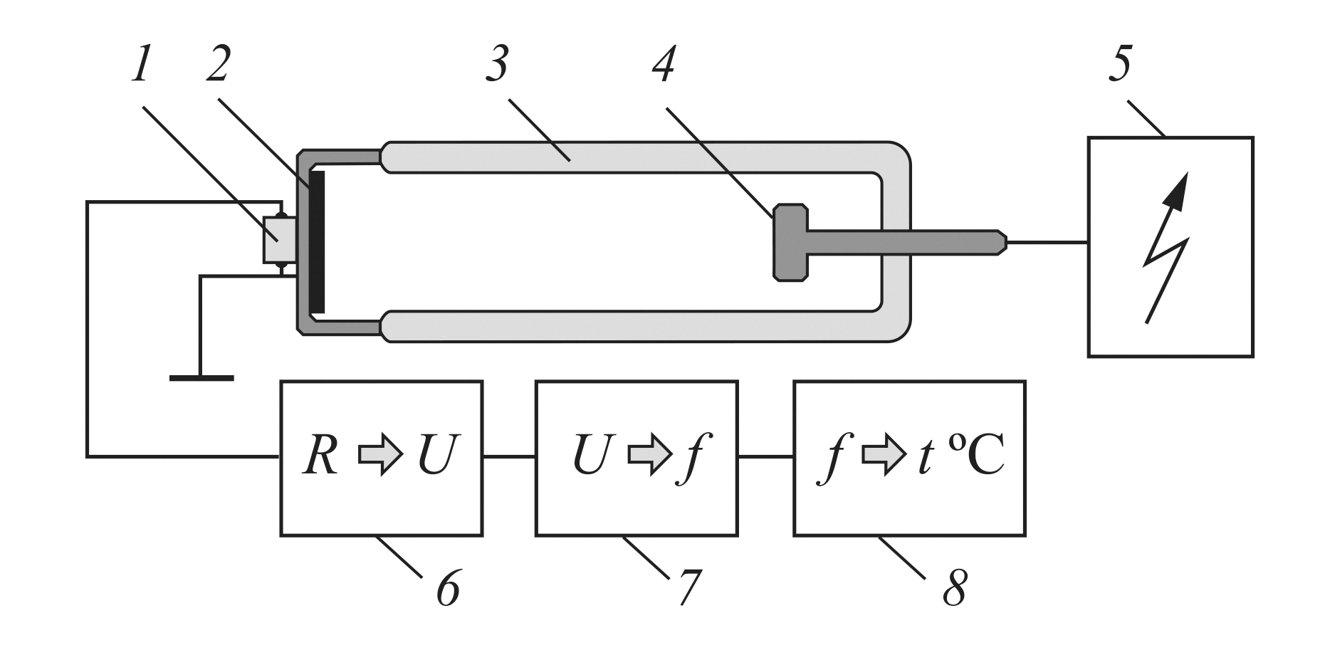 Рис. 4. Схематическое изображение НГ с отпаянной ускорительной трубкой (с “заземленной” мишенью) и термодатчика на базе кристалла синтетического алмаза: 1 – СА-термодатчик, 2 − мишень ускорительной трубки, 3 – изолятор корпуса трубки, 4 – источник ионов, 5 – высоковольтный блок питания НГ, 6 – блок формирования напряжения, 7 – ПНЧ, 8 – цифровой индикатор температуры.
