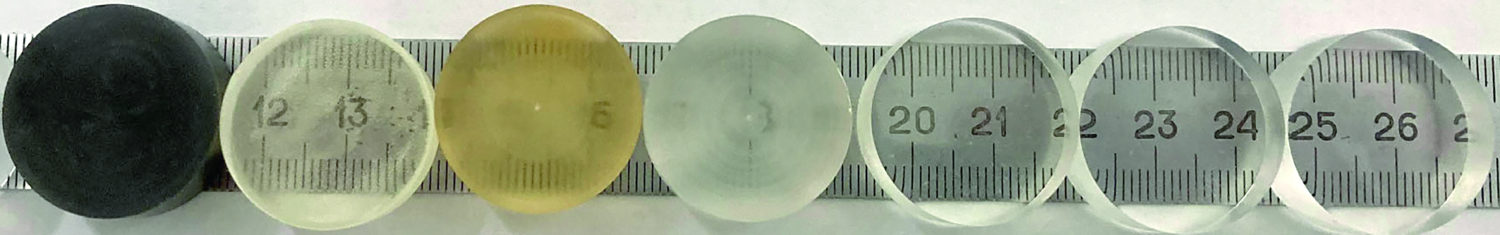 Таким образом, второе требование определило основное направление исследований – подбор полимерной основы и оптимального для нее температурного режима полимеризации. За время исследования было проведено более двух десятков полимеризаций, которые отличались друг от друга составом полимеризуемых композиций и температурным режимом. На рис. 1 представлена фотография некоторых из полученных образцов, демонстрирующая временной прогресс результатов исследования. Первые образцы получались непрозрачными или окрашенными, а образцы, полученные во второй половине периода проведения работ, внешне ничем не отличаются от обычных пластмассовых сцинтилляторов.