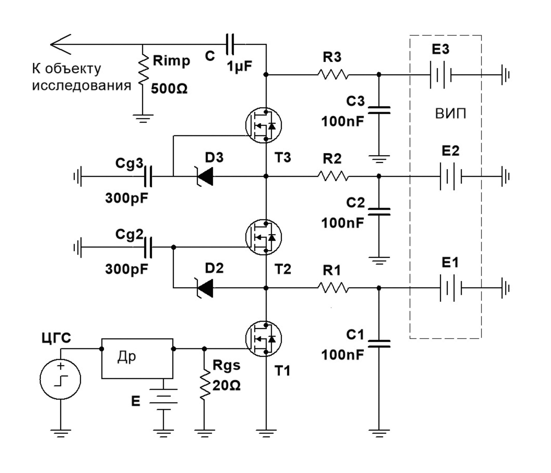 Рис. 1. Высоковольтный генератор с ключом 3×MOSFET. Транзисторы Т1, Т2 и Т3 сопряжены с нагрузочными резисторами R1, R2 и R3 и с тремя ЭДС высоковольтного источника питания (ВИП). На объект исследования высоковольтные импульсы подаются с резистора Rimp.