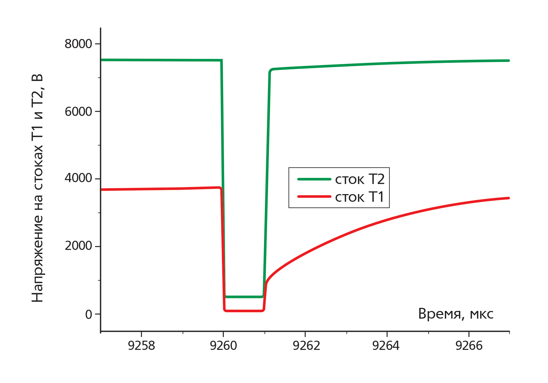 Рис. 3. Моделирование временных зависимостей напряжений на стоках IXTL2N450 (Т1) и IXTT1N450HV (Т2) в 2×MOSFET. Выравнивание напряжений на Т1 и Т2 осуществляет ВИП с двумя ЭДС, ВИП питает Т1 и Т2 через нагрузочные резисторы транзисторов R1 = 220 Ом (Т1) и R2 = 1.2 кОм (Т2) (новое техническое решение, рис. 1).