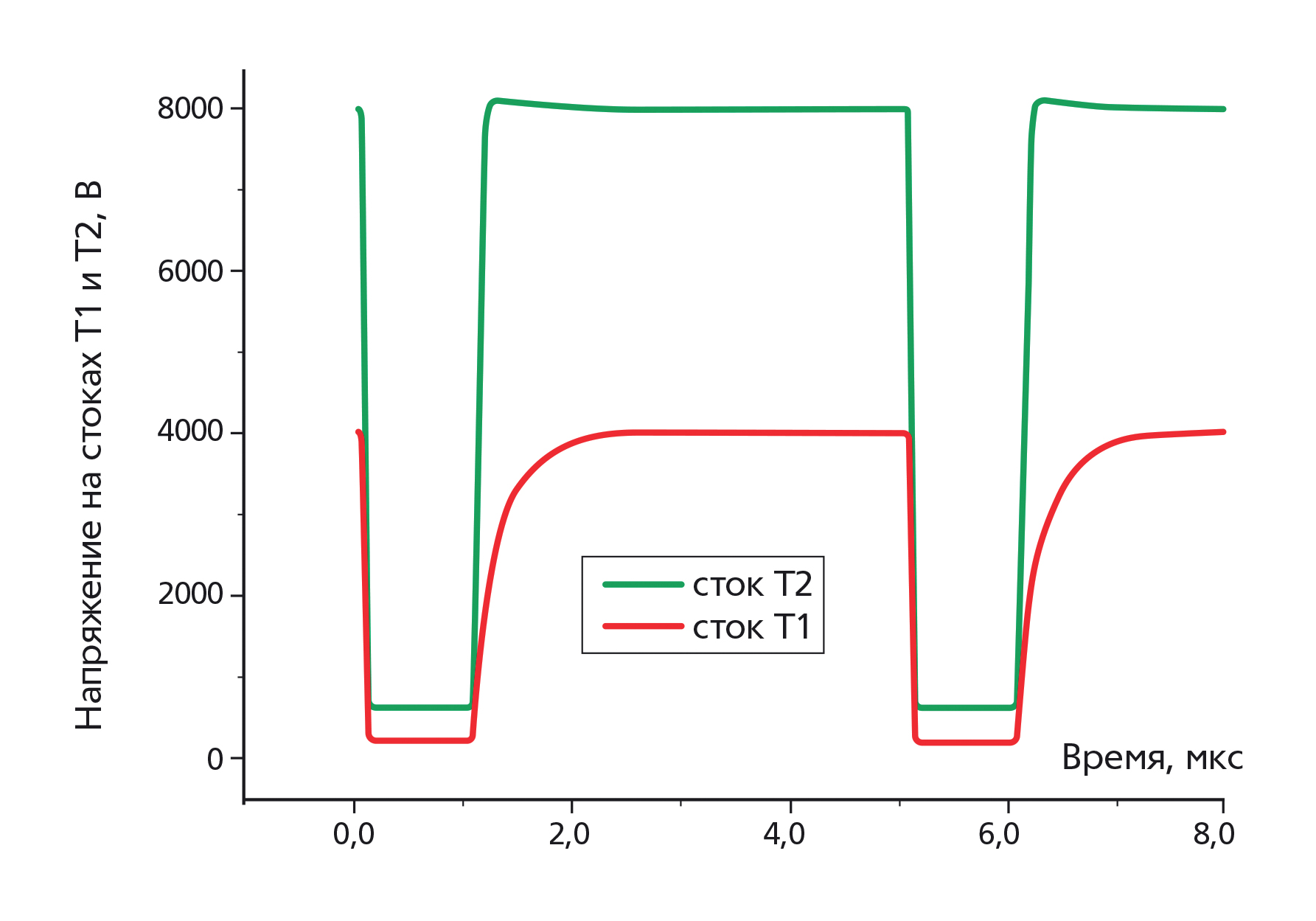 На рис. 4, 5 показано, что амплитуды ВВ-импульсов на ∆ ~ 0.5 кВ меньше, чем величины ЭДС на стоках Т1 и Т2 в состоянии OFF. Расхождение ∆ возникает из-за близости Uk к Umax, когда сопротивление канала может в несколько раз превышать значение Ron из документации на транзистор. Величину ∆ можно уменьшить, увеличивая значения R1 и R2, но это вызовет увеличение длительности переходов ON → OFF. Из сравнения экспериментальных осциллограмм (рис. 5) с данными моделирования (рис. 3) следует, что у IXTL2N450 длительность перехода ON → OFF примерно в 3 раза меньше, чем у его SPICE-модели, функционирующей в той же электрической схеме (рис. 1).