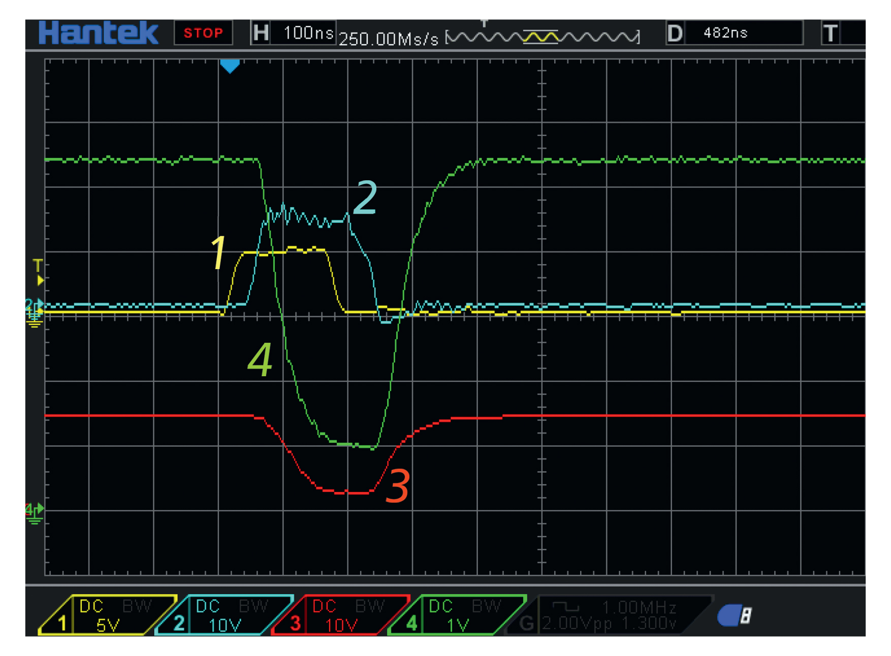 Рис. 4. Осциллограммы напряжений для 2×MOSFET: 1 – сигнал на входе драйвера FAN3224, который управляет затвором 2SK1317 (T1), 2 – импульс на затворе Т1, 3 – ВВ-импульс на стоке Т1, ВИП подает ЭДС E1 = 1.45 кВ на нагрузочный резистор R1 = 220 Ом, регистрация высоковольтным пробником (100:1), 4 – ВВ-импульс на стоке Т2 (IXTF1N450), ВИП подает ЭДС E2 = 5.4 кВ на нагрузочный резистор R2 = 1.2 кОм, регистрация высоковольтным пробником (1000:1). Скорость развертки по горизонтали 100 нс/дел, масштаб по вертикали 1 кВ/дел.