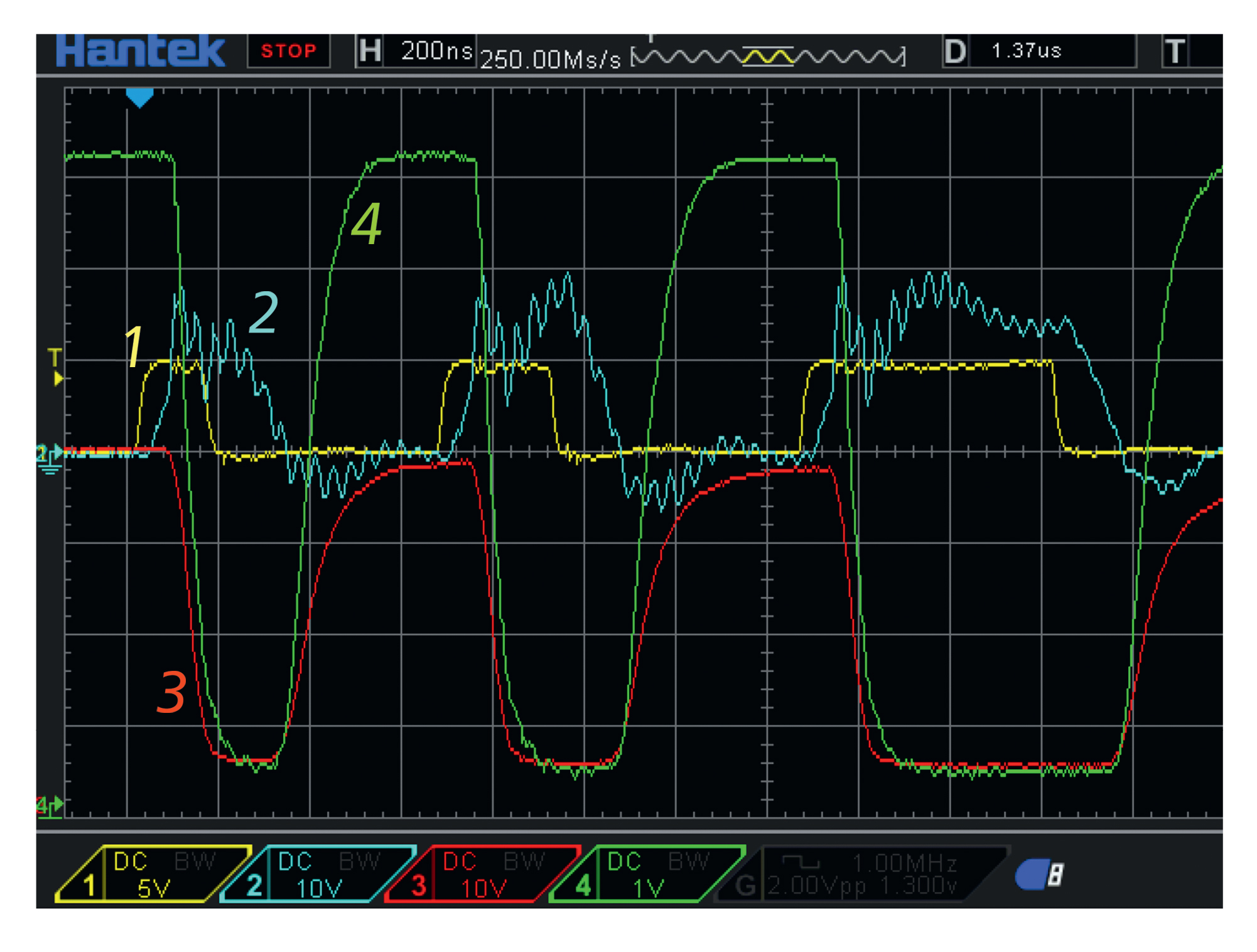 Рис. 5. Осциллограммы напряжений для 2×MOSFET: 1 – сигнал на входе драйвера FAN3122, который управляет затвором IXTL2N450 (T1), 2 – импульс на затворе Т1, 3 – ВВ-импульс на стоке Т1, ВИП подает ЭДС E1 = 4.0 кВ на нагрузочный резистор R1 = 220 Ом, регистрация высоковольтным пробником (100:1), 4 – ВВ-импульс на стоке Т2 (IXTH1N450HV), ВИП подает ЭДС E2 = 7.3 кВ на нагрузочный резистор R2 = 1.2 кОм, регистрация высоковольтным пробником (1000:1). Скорость развертки по горизонтали 200 нс/дел, масштаб по вертикали 1 кВ/дел.
