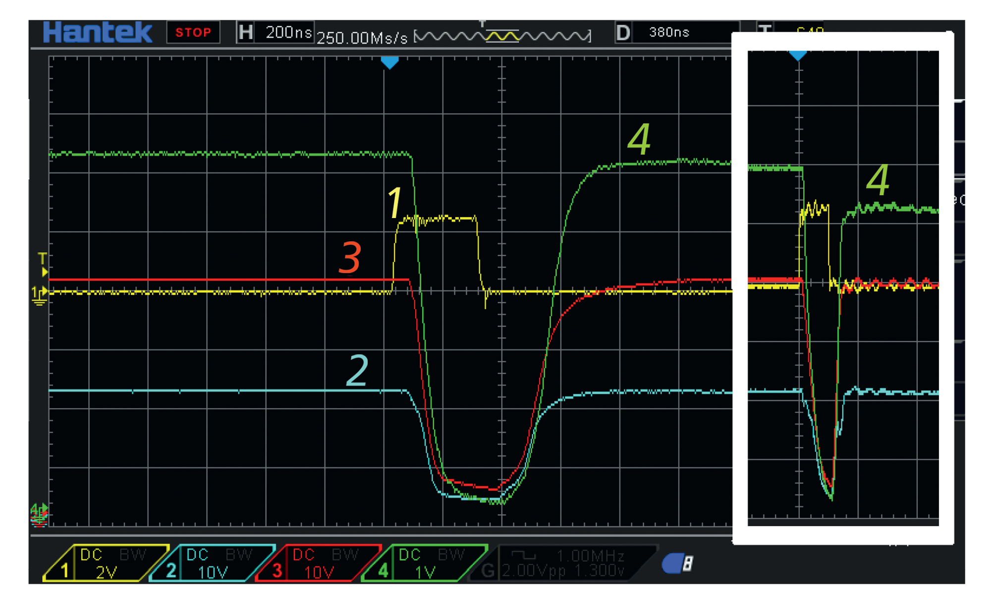 Рис. 6. Осциллограммы напряжений для 3×IGBT: 1 – сигнал на входе драйвера FAN3122, который управляет затвором T1 (IXBH12N300), 2 – ВВ-импульс на коллекторе Т1, ВИП подает ЭДС E1 = 2.3 кВ на нагрузочный резистор R1 = 1.6 кОм, регистрация высоковольтным пробником 100:1, 3 – ВВ-импульс на коллекторе Т2 (IXBH12N300), ВИП подает ЭДС E2 = 4.2 кВ на нагрузочный резистор R2 = 1.6 кОм, регистрация высоковольтным пробником 100:1, 4 – ВВ-импульс на коллекторе Т3 (IXBH12N300), ВИП подает ЭДС E3 = 6.3 кВ на нагрузочный резистор R3 = 1.6 кОм, регистрация высоковольтным пробником (1000:1). На вставке: R1 = R2 = R3 = 200 Ом. Скорость развертки по горизонтали 200 нс/дел, масштаб по вертикали 1 кВ/дел.