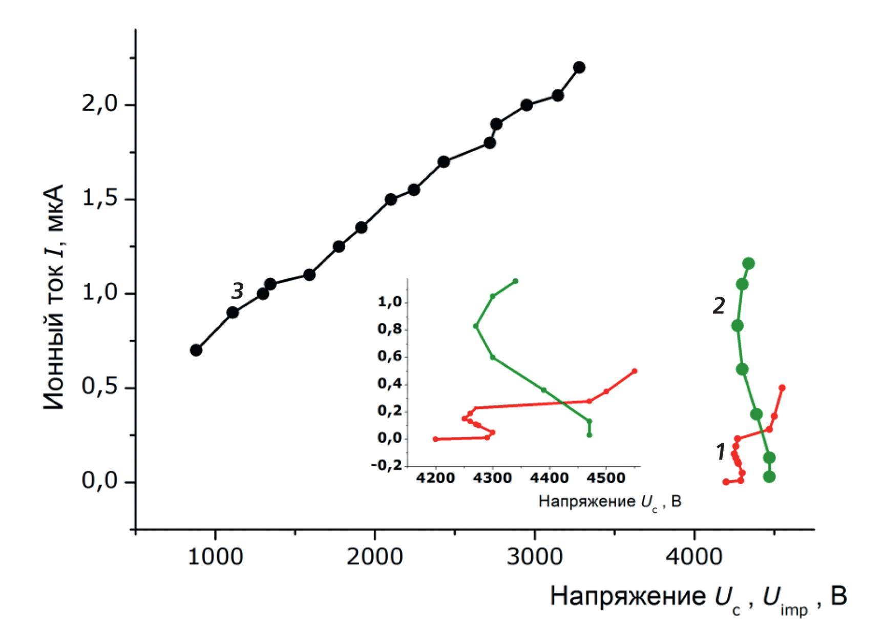 На рис. 7 (графики 1 и 2) представлены характерные ВАХ вакуумной эмиссии ионов при ее возбуждении регулируемым Uc. Подавление неустойчивости тока осуществляет балластный резистор Rb = 1 ГОм (отрицательная обратная связь), что позволяет регистрировать данные на участке ВАХ с отрицательным дифференциальным сопротивлением. График 1 соответствует повышению, а график 2 – понижению напряжения в системе. На рис. 7 график 3 соответствует возбуждению Uc + Uimp эмиссии (токи до 2.2 мкА) с длительностью Uimp импульсов 400 мкс (частота повторения 20 Гц).