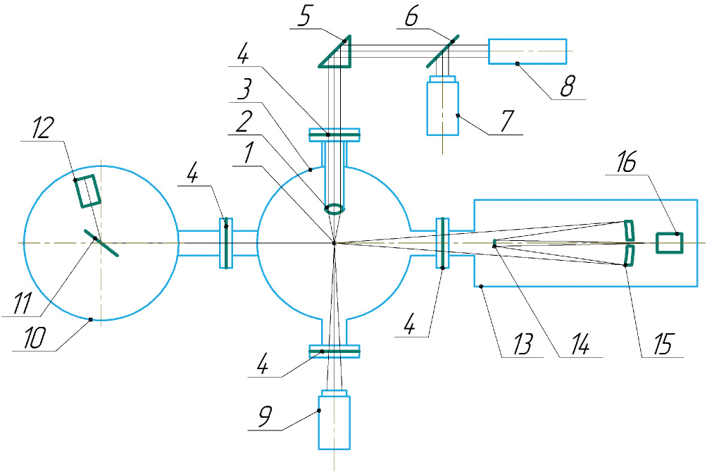 Рис. 1. Оптическая схема установки: 1 – зона разряда, 2 – фокусирующая линза, 3 – корпус установки, 4 – оптический ввод, 5 – отклоняющая призма, 6 – делительная пластинка, 7 – детектор мощности лазера, 8 – лазер Nd:YAG, 9 – измеритель мощности, 10 – ЭУФ-спектрометр, 11 – зеркало, 12 – детектор излучения, 13 – МР-микроскоп, 14 – выпуклое зеркало, 15 – вогнутое зеркало, 16 – детектор.