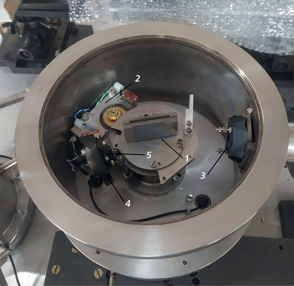 Рис. 2. Устройство зеркального спектрометра: 1 – многослойное рентгеновское зеркало, 2 – шаговый двигатель, 3 – входной пленочный фильтр, 4 – выходной пленочный фильтр, 5 – детектор.
