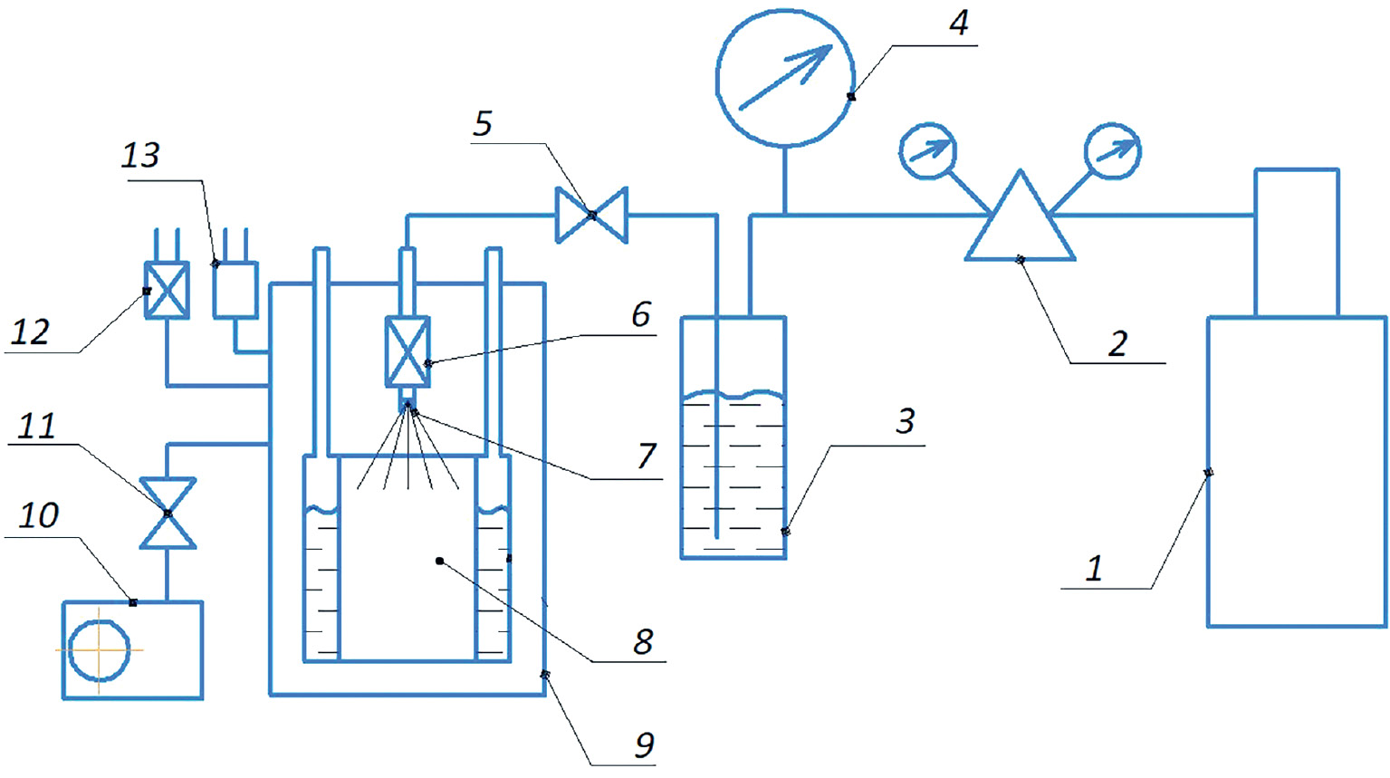 Рис. 3. Схема вакуумной откачки: 1 – баллон с газом, 2 – редуктор, 3 – объем с жидкостью, 4 – манометр, 5 – запорный клапан, 6 – форсунка, 7 – сопло, 8 – криогенный насос, 9 – корпус установки, 10 – форвакуумный насос, 11 – клапан, 12 – датчик ПМТ-2, 13 – датчик ПММ-32.