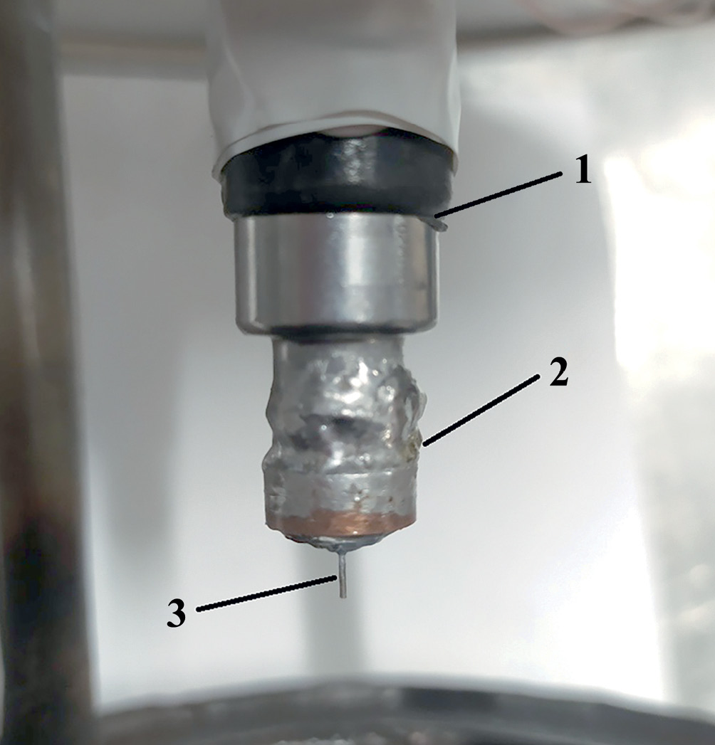 Рис. 4. Фото сопла: 1 – форсунка, 2 – крепеж, 3 – игла.