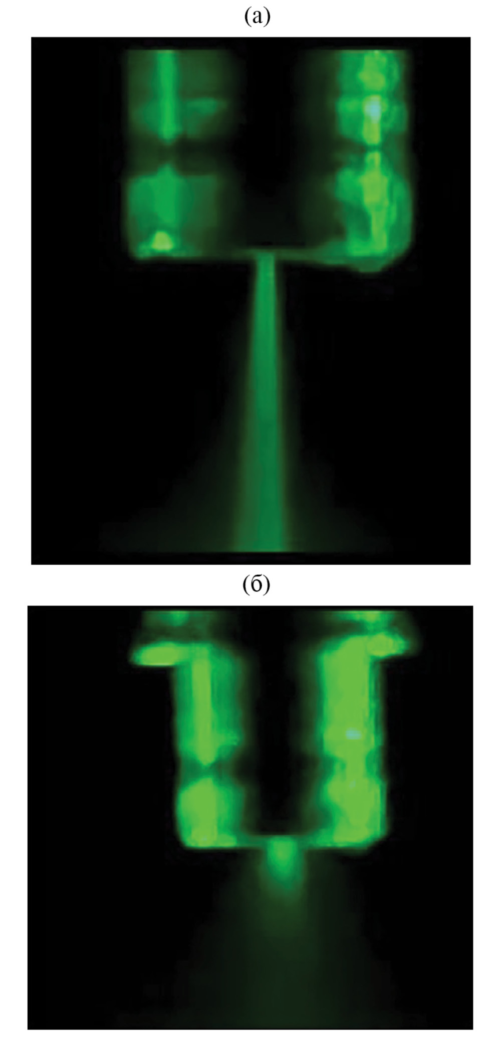 Проводились исследования структуры жидкой струи при истечении из штатного отверстия форсунки и через капилляр на базе игл G26 и G30. На рис. 5 изображены фото струи изопропилового спирта при истечении в атмосферу (рис. 5а) и в вакуум через штатное отверстие форсунки диаметром 250 мкм (рис. 5б). Жидкость подается при давлении 4 бар. Истечение жидкости – импульсное, длительность импульса 800 мкс. Углы раствора при истечении в атмосферу α = 8.5˚, при истечении в вакуум α = 35˚.