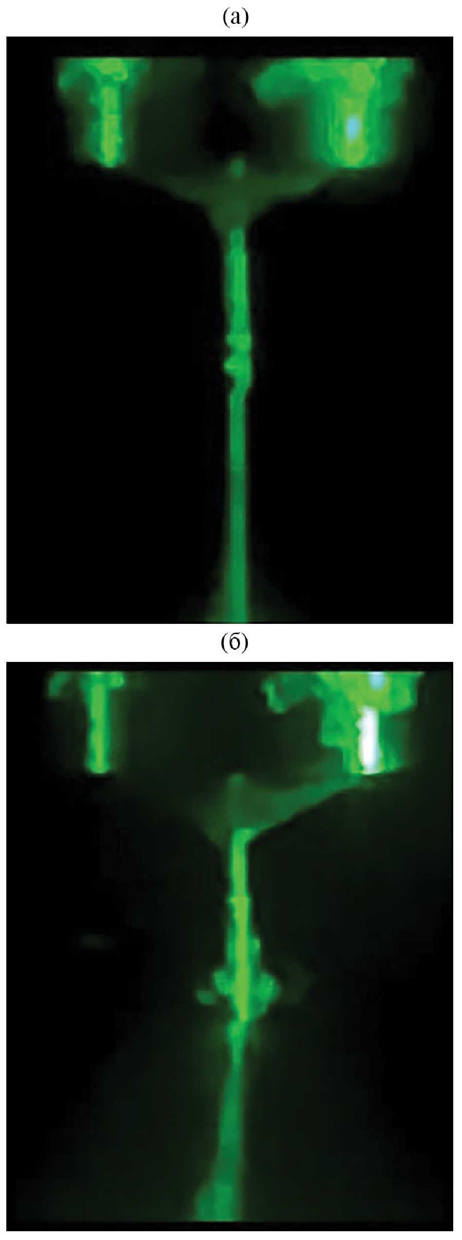 На рис. 6 изображены фото струи изопропилового спирта при истечении в атмосферу (рис. 6а) и в вакуум через иглу (рис. 6б). Жидкость подается при давлении 4 бар. Истечение жидкости – импульсное, длительность импульса 800 мкс. Угол раствора α = 2.5˚ при истечении в атмосферу и α = 11˚ при истечении в вакуум.