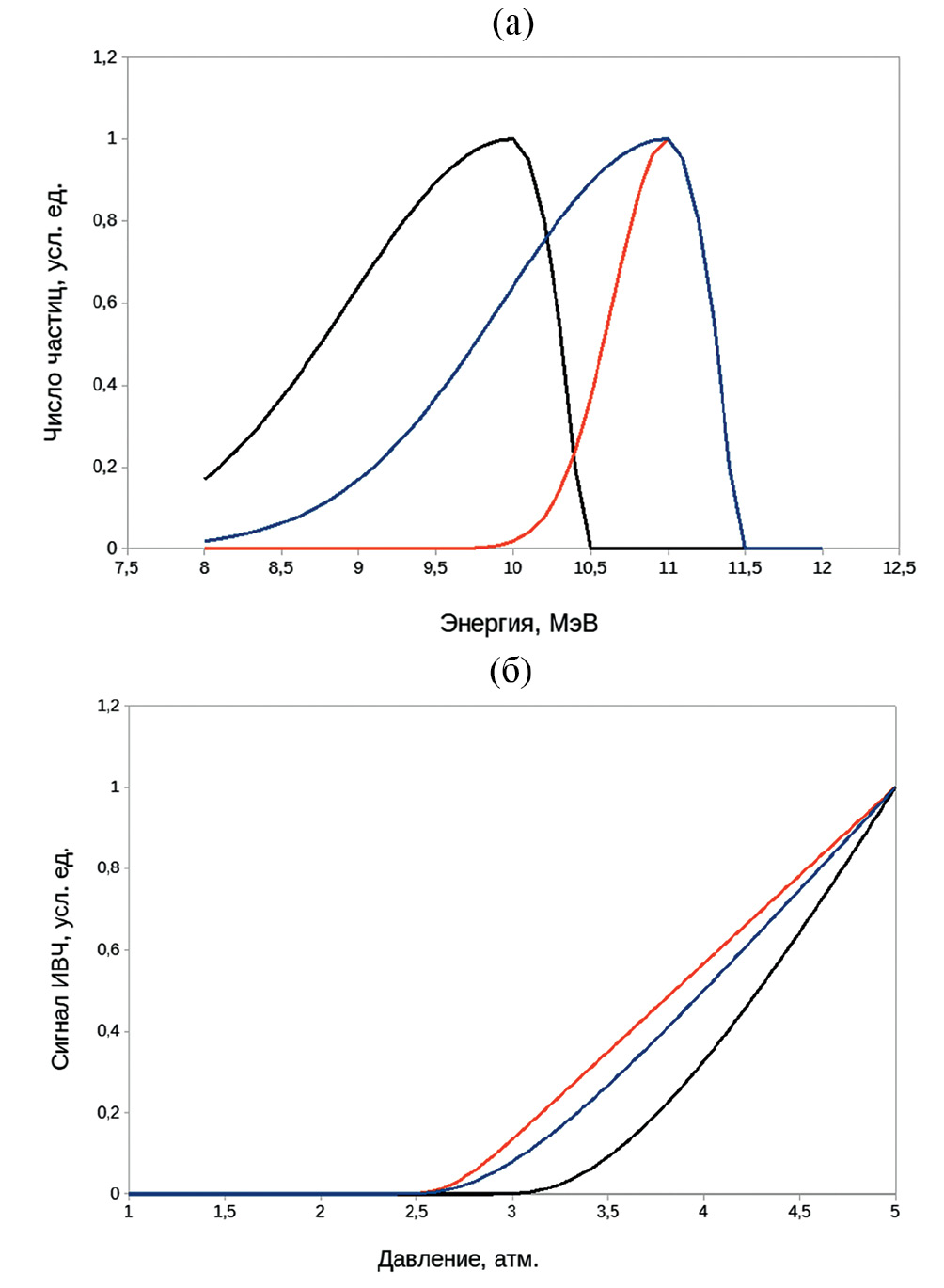 Рассчитанные зависимости состоят из трех участков: горизонтального, где ИВЧ отсутствует; линейного по давлению, на котором все частицы в пучке излучают в соответствии с формулой (10); и нелинейного участка, соединяющего два предыдущих, на котором излучают лишь те частицы, для которых выполняется условие (2б) или, более грубо, (8). Зависимость интенсивности ИВЧ от давления на этом участке описывается формулой (9). Известно [2−4], что по зависимости I(P) на данном участке можно восстановить энергетический спектр пучка, однако, эта задача является некорректно поставленной и даже при высокой точности измерений требует использования тех или иных методов регуляризации для получения разумного приближения к реальному спектру [10].
