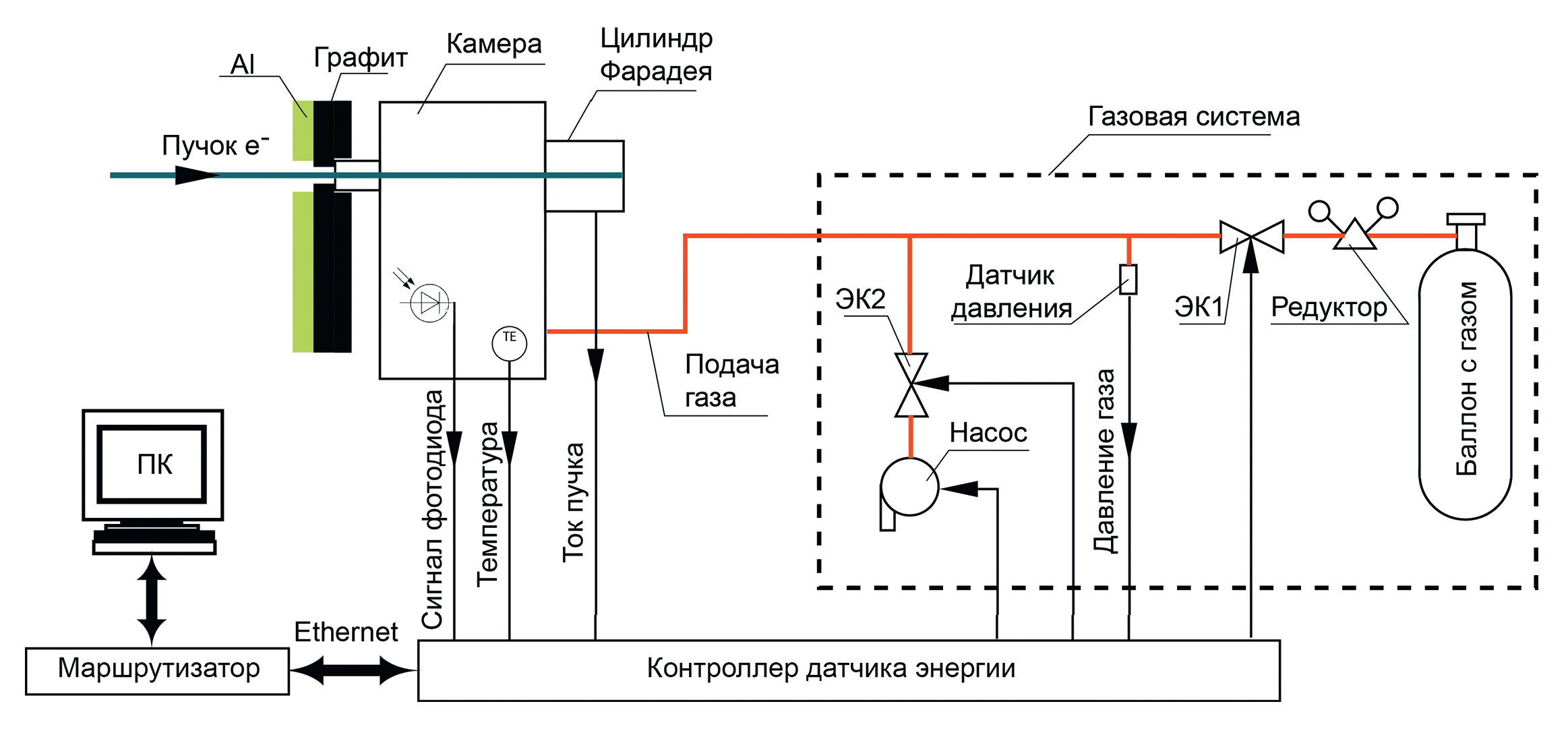 Блок-схема датчика энергии пучка электронов показана на рис. 2. Датчик энергии состоит из камеры взаимодействия, газовой системы, контроллера и персонального компьютера с программным обеспечением.