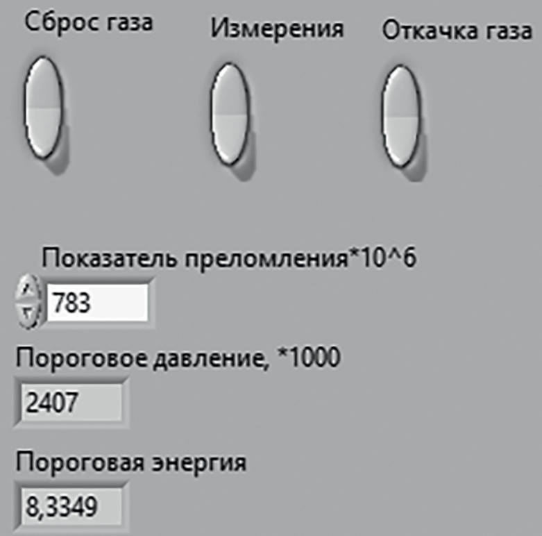 Измерение сигналов с фотодиода, датчика температуры, цилиндра Фарадея, датчика давления, а также подача питающих напряжений на электромагнитные клапаны и насос осуществляется с помощью специально разработанного контроллера. Измерение величины сигнала фотодиода проводится методом выборки-хранения в фиксированный момент времени после начала импульса тока пучка. Контроллер функционирует под управлением специальной программы, установленной на персональном компьютере, обеспечивающей прием и обработку данных, а также графический интерфейс оператора. Вид графического интерфейса оператора показан на рис. 4. Оператор дает команду на начало измерений, которые проводятся в автоматическом режиме с последующей выдачей оцененного значения средней энергии пучка. Полный цикл измерений занимает около 2–3 минут, что значительно быстрее, чем при использовании других методов измерения энергии.
